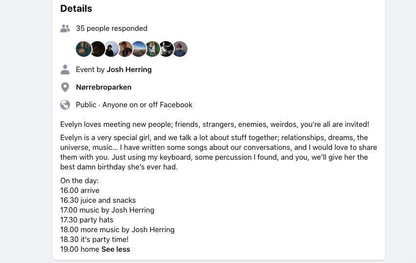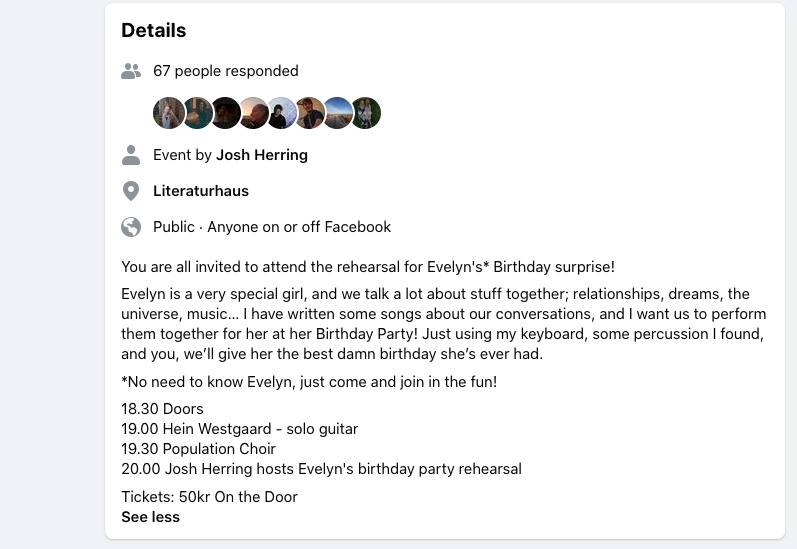 We decided in the end to lean into the birthday party scenario, in order to discover what might happen when these mysteries are left in tact. On reflection I like that the whole experience, from invitation to the end of the concert there existed the birthday narrative, because I believe in making everything genuine, the authenticity of the performance and intention behind it become strengthened.