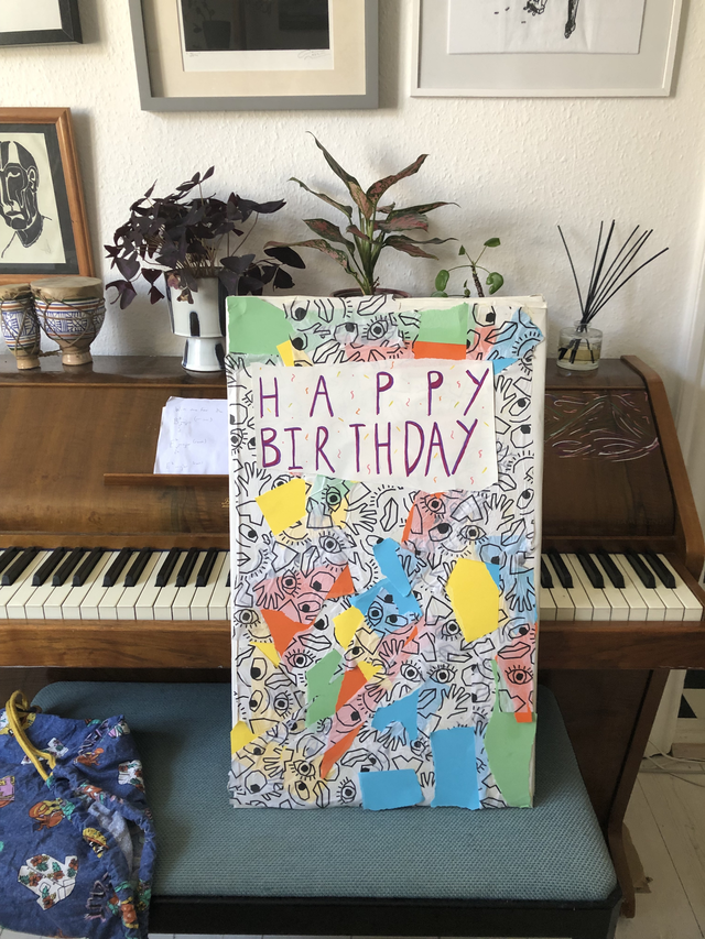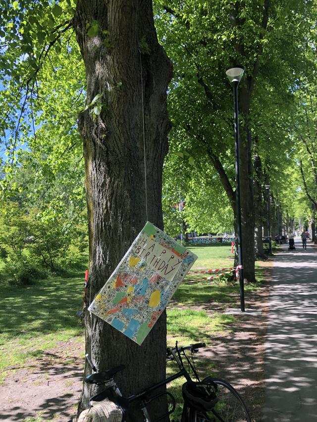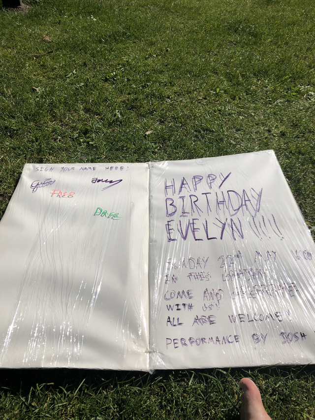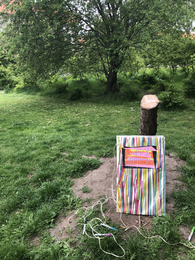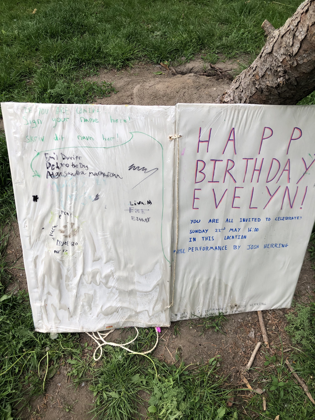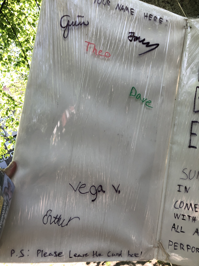 This time I tied the card to a tree stump, following the advise of the groundskeeper, Torben. Unfortunately I don’t believe this card was as successful… there was a dog paw print which broke my waterproofing system and the card got wet and looked kind of gross. Also someone had written ‘fuck’ around the paw print, which I don’t know was an insult to the card, or if they were trying to apologise for the paw print… either way it didn’t look great in the end. The cherry on the cake was when performing the birthday set in the park, I had left the card nearby so I might get a few final signatures, but then a few dogs saw it as a great place to piss, so it got even more soaked. The card is maybe still there, I don't dare go back and check...
