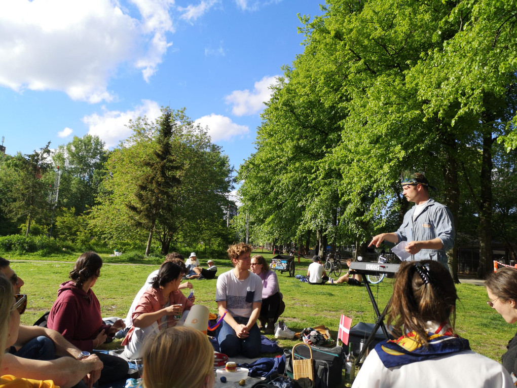 The performance of the birthday party was not as successful as the performance of the rehearsal. This was my first and only attempt to perform the birthday party again after beginning the rehearsal format, and I was reminded of how restrictive the birthday party format is. In addition to this, performing, especially sining outside is difficult and doesn’t sound particularly great. This being said, the audience I had gathered around me were attentive and participating, and I managed to include a few of the public around in the park. I went over to some people to give them instruments to play, and they played along. I spoke to one guy afterwards about his experience.