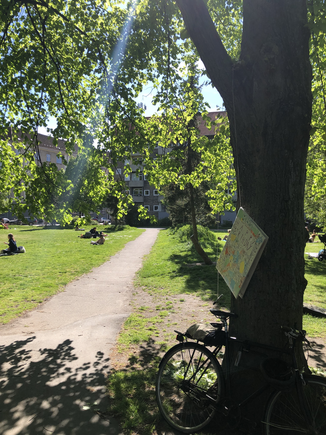 I was optimistic when, as soon as I had hung the card in a tree, a group of kids walked past in their football kits and had wanted to sign the card. Two of them stepped up and signed and the rest moved on. Not that I expected the kids would actually come to the concert, but I felt like I had made a piece of participatory public art that, if nothing else introduced the community to the idea of community concerts in public spaces. Unfortunately however, when I returned the following day to check on the progress, the card had disappeared, leaving only the roll of string I got stuck in the branches as I tried to trow it over when hanging it up. There was a woman cleaning out the rabbit hutch next to the tree wearing a Kommune shirt, so I asked her if she knew anything about it. She fetched her boss who came and told me that his colleagues had thrown it away, as it is forbidden to hang anything in trees (unless you are a political party during an election). I was devastated. He said he thought the card was funny, and was apologetic that they had had to throw it away. I was not deterred however, so I made another one.