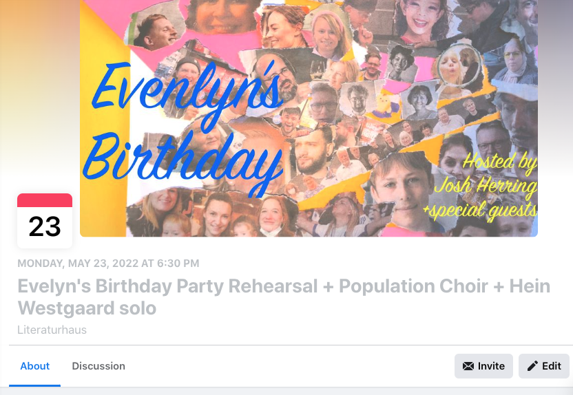 There are a number of events where Evelyn's birthday, either as the party itself or its rehearsal form, has been performed I want to share with you. Included in these events are some audience 'before and afters', testimonials to the experience of participation.