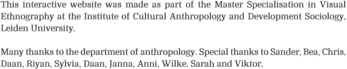 As part of the Visual Ethnography master’s at Leiden University, this interactive website invites you to join my interlocutors and me to walk, hear and see with us the Hatertse and Overasseltse fens (near Nijmegen). After four months of fieldwork – I conducted semi-structured interviews, recorded collaborative footage and performed sensory walks – I studied human-nature relationships of educated individuals with extensive knowledge of this area. In presenting the various experiences, I analysed four workable concepts (wind, noise, crowdedness, and pathways) that shape the immersive perception of visitors. This interactive website and creative methodologies used provided me as a visual anthropologist with possibilities to research human-nature encounters within the epoch characterised as the Anthropocene. So, walk with us and experience this extraordinary environment!