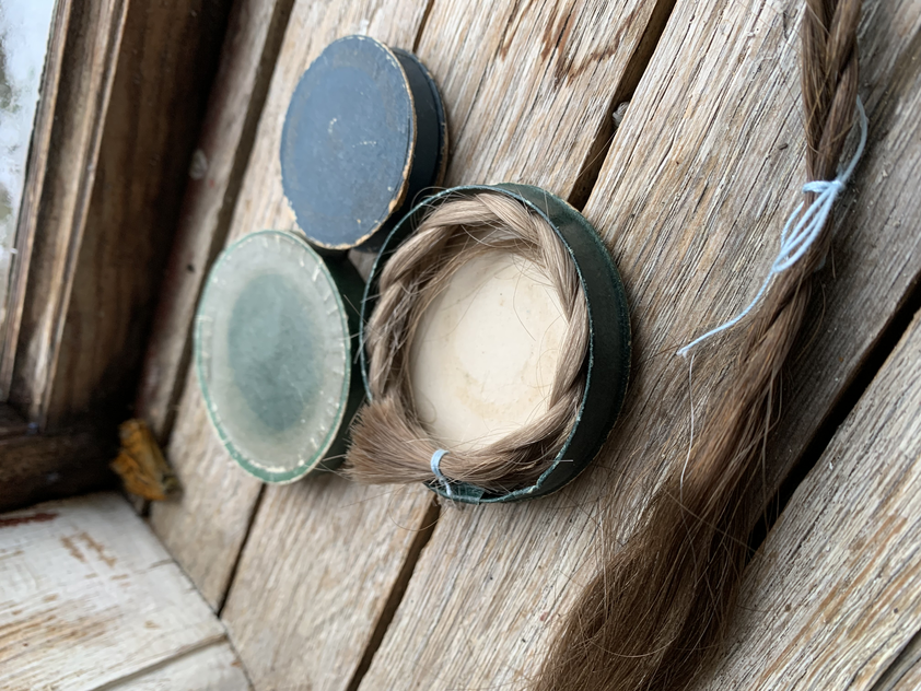 When connected to a name or a portrait it is difficult to see a strand of hair or a braid as mere material. It has undergone a different transformation and entered the realm of remembrance’s or maybe remains and relics. A reminder of life or relation that’s lost? A strand of hair, a piece of a nail, a voodoo charm…