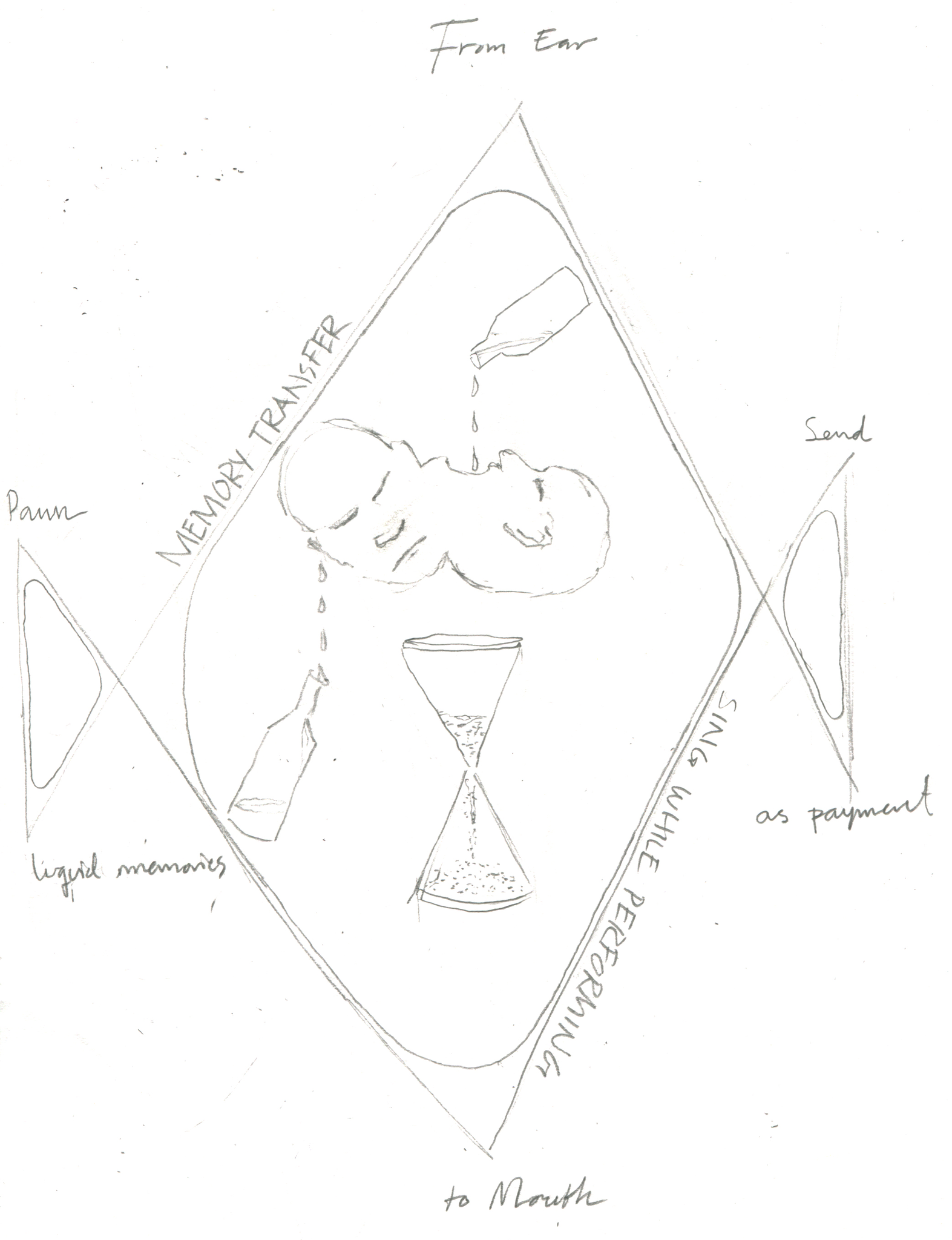 In Chronos’ Bank of Memories, the template ritual of sale become distorted by musically paced interaction and a mood that is somewhat surreal. When offering their goods, singing bird-like characters circle around the visitor, placed in a cage. Liquid memories, soft and undefined enough to be transferred, are tapped from visitors who are paid with dusty sand from the beach where memories go to die.