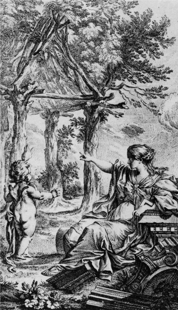 fig1. Frontispiece of Essai sur l’architecture by Marc-Antoine Laugier. Allegorical engraving of the Vitruvian primitive hut