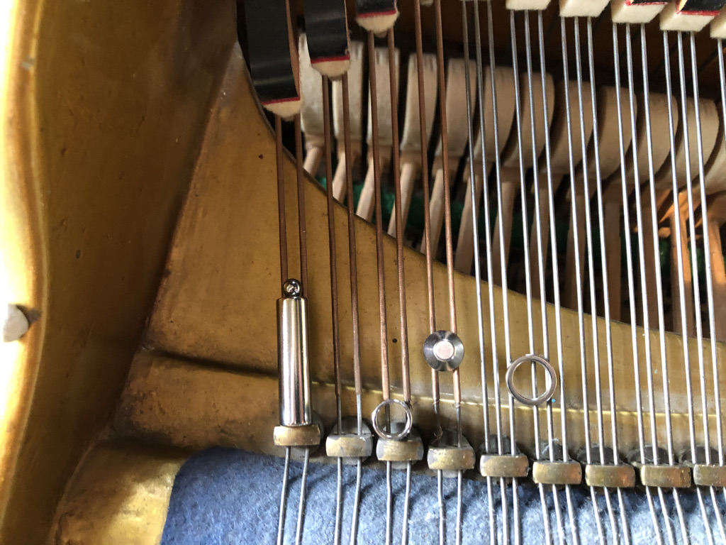Placing the magnets on the strings of the piano, I’ve relied on my ears in finding the different nodes (zero amplitude) and antinodes (maximum amplitude) of various wave forms. This could relate to either a fundamental wave or the partial, or harmonic wave forms.