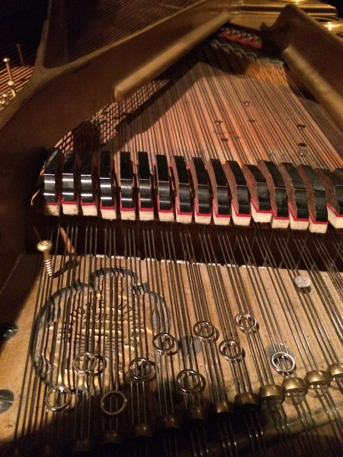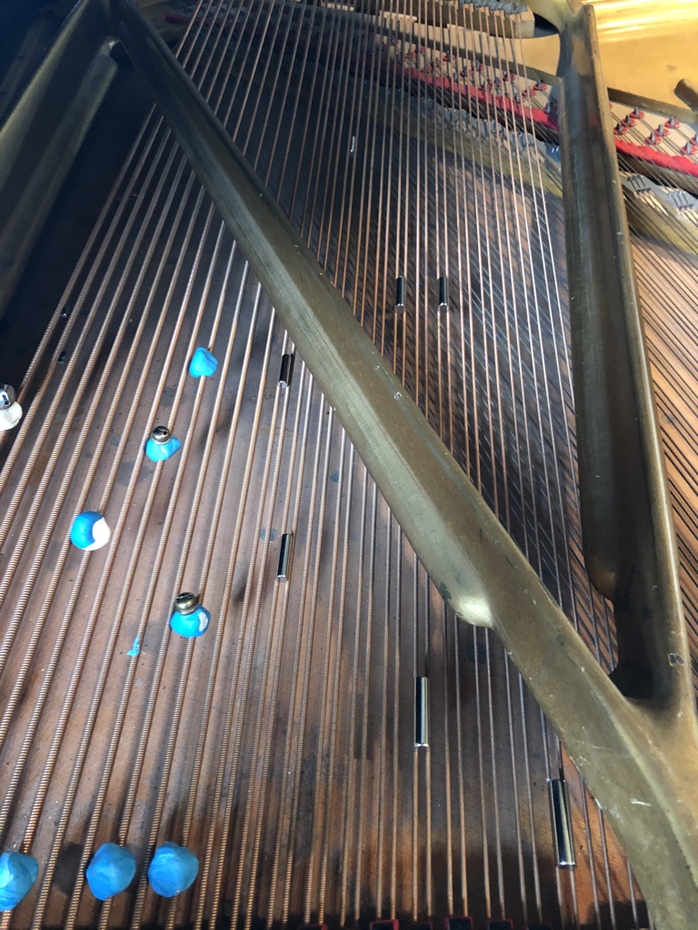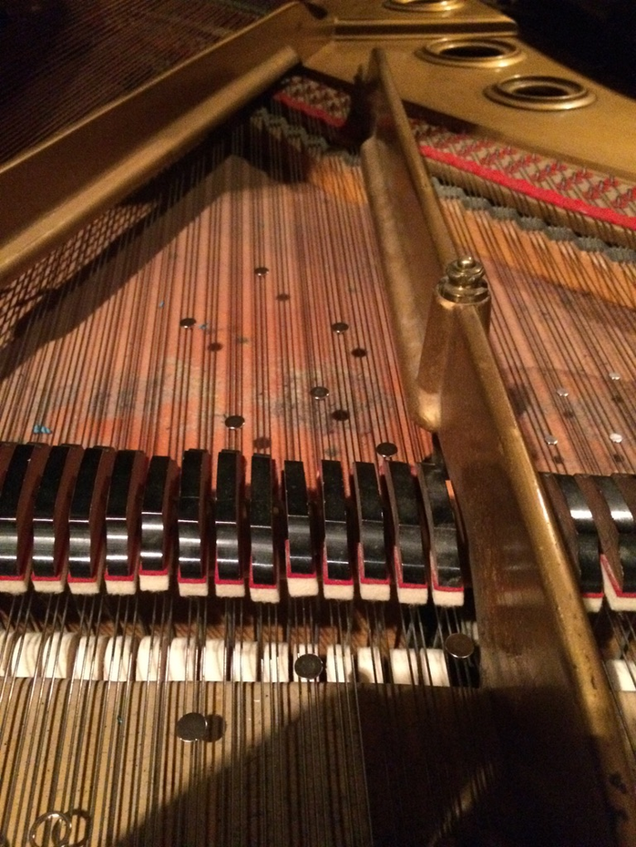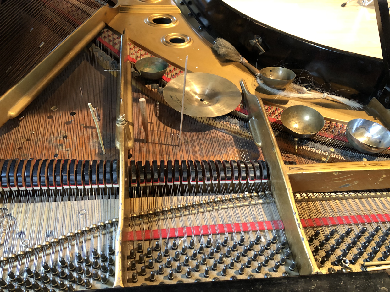 A prepared piano can be described as having its sounds altered by various objects placed on, or within the resonating strings. In my case, I’ve chosen to work with metallic preparations and almost exclusively, magnets of various sizes, shape and weight. These include cones, spheres, squares, cylinders, magnet towers, rings, and nearly microscopic magnetic shards for subtle sympathetic vibrations. I’ve also been working with screws, bolts, bells attached to puddy, horse hair, rounded metallic bowls and more.