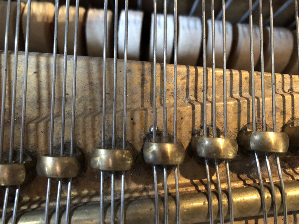 Placing the magnets on the strings of the piano, I’ve relied on my ears in finding the different nodes (zero amplitude) and antinodes (maximum amplitude) of various wave forms. This could relate to either a fundamental wave or the partial, or harmonic wave forms.
