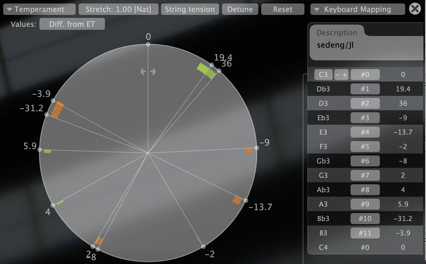 The tuning system purposely breaks down the strict keyboard layout dichotomy between the 5 black keys (pentatonic) and the seven white keys (heptatonic). The just intervals and Balinese pentatonic are distributed across and beyond any black or white key demarcations. As an improviser, this has been especially important in avoiding clichés, recognizable or habitual shapes, patterns and vocabulary. In the future, I aim to do away completely with this black and white visual dichotomy and work with a new conceptual framework for the keyboard.