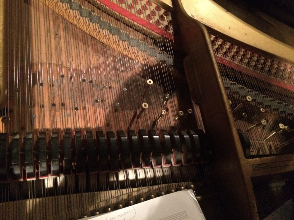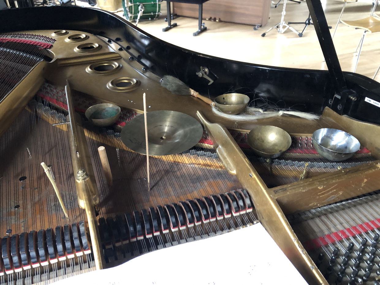 The new tuning and preparations have changed the way I interact with the piano. The tuning offers a much wider range of musical intervals. The intervals do not conform to an equal temperament and are thus microtonal. It’s challenged my habitual practice as a pianist in several ways. Firstly, I’ve had to explore new harmonic and melodic vocabulary, patterns, shapes and dismantle taken-for-granted principles. Principles like up and down are rendered meaningless when, for instance, a large mass of metal is attached to the resonating strings. In this particular instance, the fundamental frequency can be transposed down several octaves or perhaps a partial is coloured to such a degree that It loses its perceived pitch locality. Therefor the instrument loses its conventional sense of pitch chronology and becomes non-linear. Another area of interest involves the lightness versus heaviness of physical touch when pressing the keys. Each key has a specific sweet spot resonance in terms of how heavy or light it should be depressed. This is because of the delicate metallic preparations and the resulting multi-phonics that can be achieved with the right sense of physical touch. The matter can become problematic when combining two or more sounds simultaneously. For this reason I have almost completely avoided triads or larger chords as they have a tendency to collide with one another/cancel the resonances of each tone and oversaturate the overall sound canvas. Relating the piano, at least conceptually, to a modified Gamelan orchestra with timbral constituents, I avoid harmonic or melodic hierarchies and instead focus on amassing new sets of colour combinations on the sound canvas (whether composed or improvised). At this stage my habitual playing patterns have broken down along with conventional linearities.