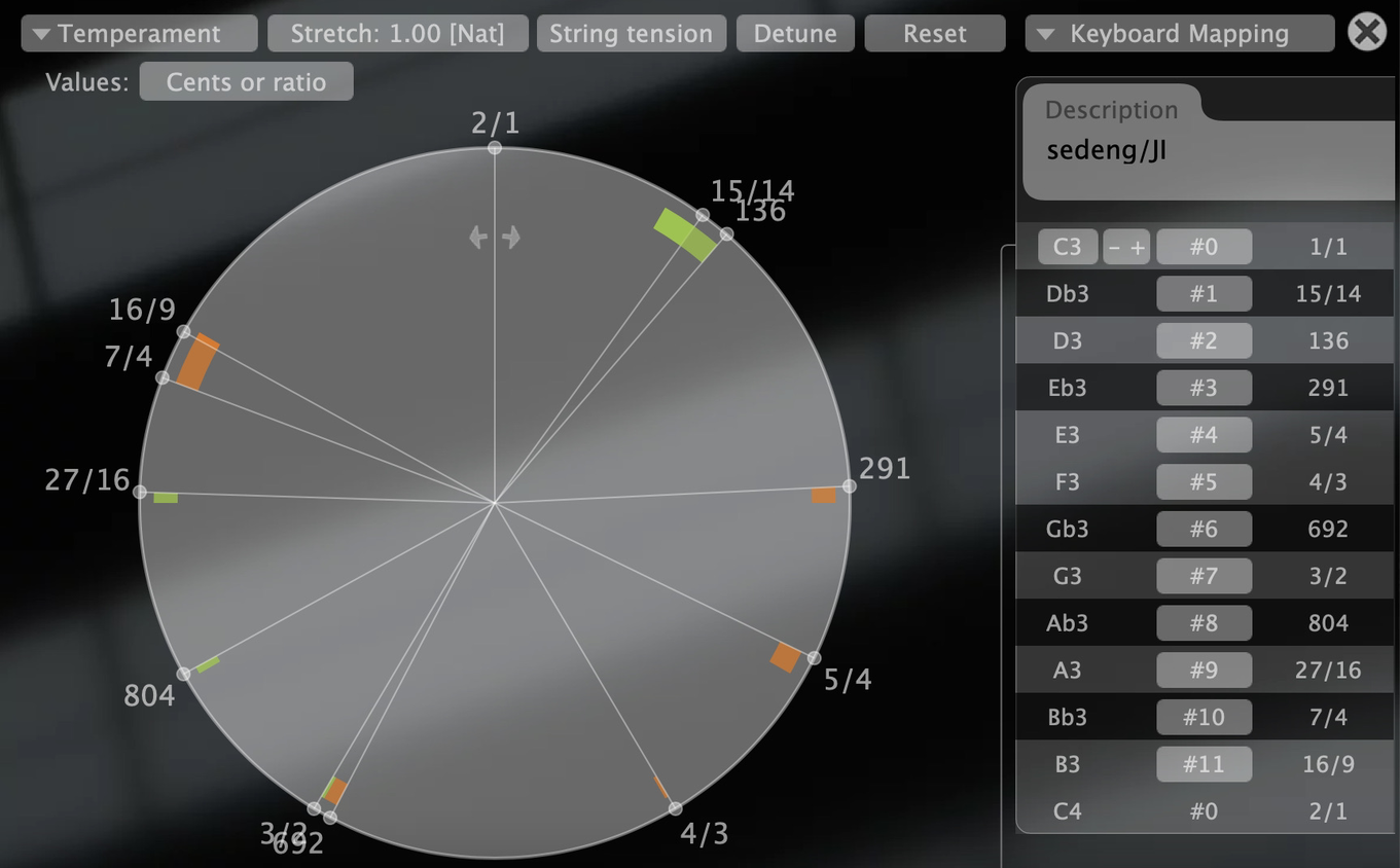 My tuning system confronts friction points between “harmonicity” and “inharmonicity”. In this context, harmonicity relates to Just Intonation and inharmonicity relates to a Balinese Gamelan pentatonic mode, called sedeng-pelog (a five note subset of the seven-note mode pelog composed of medium-sized microtonal intervals). I’m interested in how these seemingly juxtaposed systems of tuning organization can co-exist.
