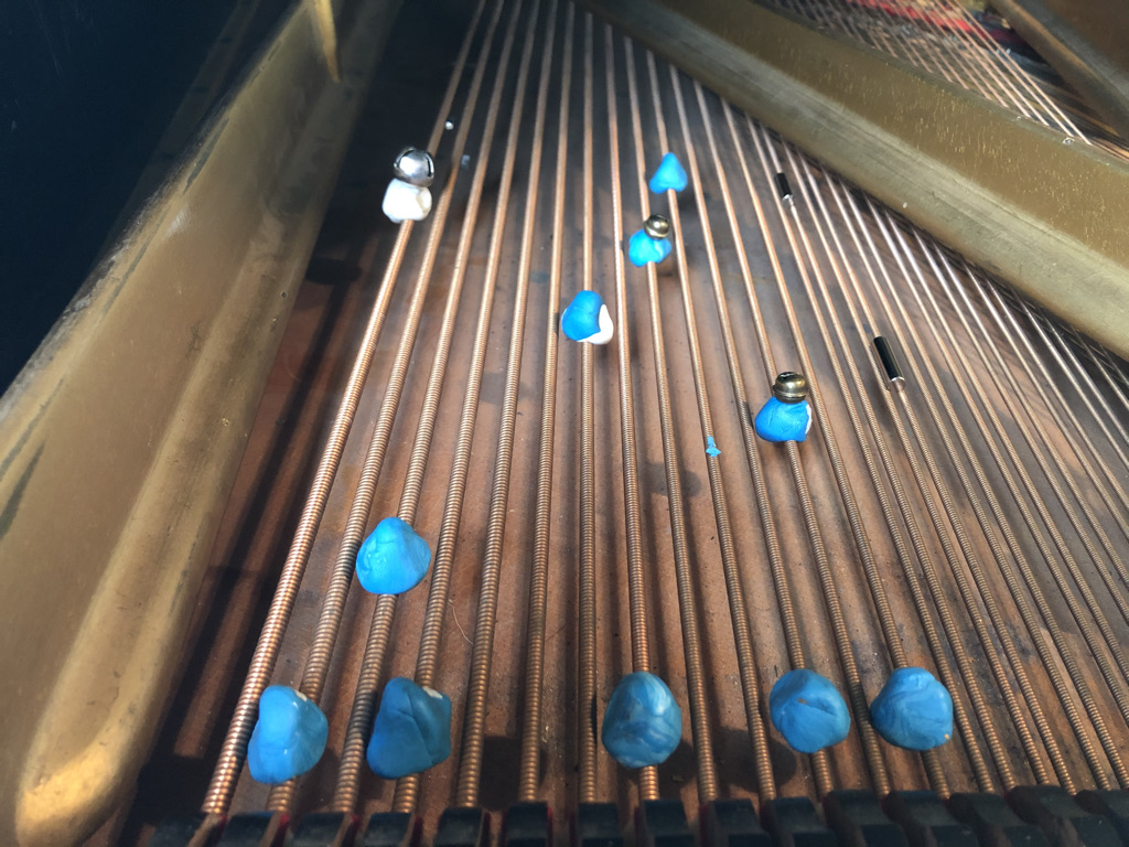 Placing a preparation (object) on a strings node will create minimum resonance while placement on an antinode will generally give greatest resonance. There is a delicate unpredictability in finding the resonance points. The foreign objects (preparations) bring their own physical makeup and thus we have two meeting entities towards one, or several produced sounds. As a composer and improviser, my interest lies in finding the “right” balance between harmonicity and inharmonicity for a given preparation, or sound entity. There is no hierarchy in terms of resonant sounds being “good” and non resonant sounds being less desired. In some cases, It is more aesthetically preferable to place a preparation directly on a node, and thus opt for a more deadened sound quality.