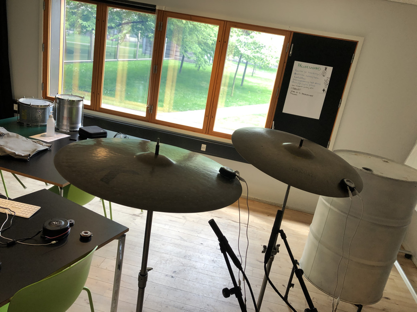 In creating an interactive and embodied space for the audience and us, the performers, me and Simon Mariegaard placed transducers on four separate sound sources, or sound objects. We placed: two transducers on the microtonal prepared piano’s sound board; two transducers on two circular ride cymbals (directly above the piano); and a bass transducer on the wooden floor underneath the piano. We also had sound coming from a quadraphonic, or four-speaker arrangement.