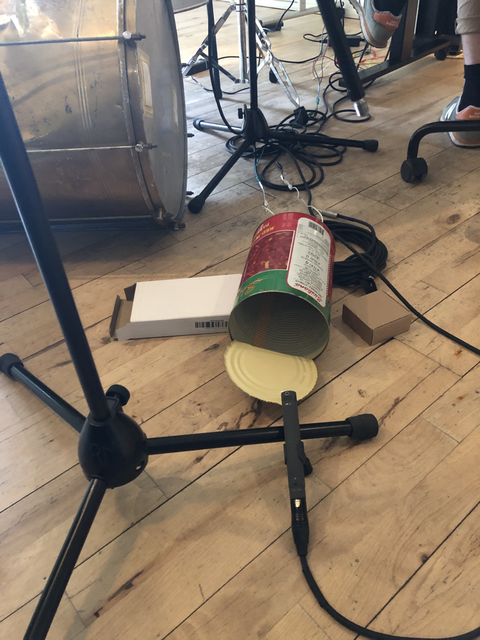 We started by sampling various objects including, resonant floor toms, circular cymbals, metallic cans of various sizes, a large oil can, and random surfaces of wood and metal. This was done by sending a short saxophone excerpt through a single transducer (attached to the object in question) and making notes as to certain sonic qualities. It was important to find the right volume level and frequency equalization as certain sound objects could handle very little gain before distorting beyond use. Others, including the oil can could handle a lot of gain before distorting. In choosing what music to re-amp through which object It was important to also experimentally gain knowledge of resonant frequencies of the objects and how certain inputed frequency bands would affect the overall sound character.
