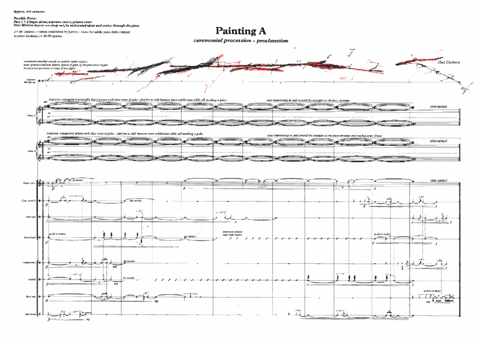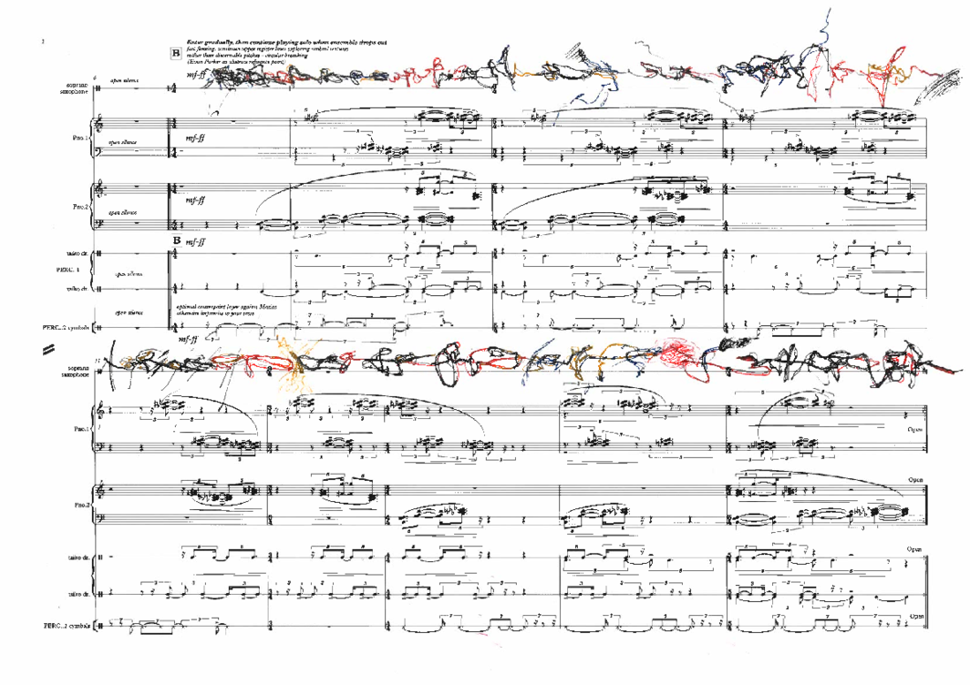 Soprano saxophone was a late addition to the ensemble. It was in response to my desire for limited sectional or momentary use of heightened affect and unexpected changes in timbre and texture. I had several conversations with Lotte Anker relating to how we might achieve this. The examples I drew from include: the microtonal bagpipes used in Bulgarian folk music and how they often enter abruptly and for only short periods, taking the music and accompanying dance to a frenzied state; the suling (flute) that can enter unexpectedly and for relatively short periods of time within Balinese and Javanese Gamelan music; the way Wayne Shorter climaxes compositions within the context of his new quartet (with Danilo Perez, John Patitucci and Brian Blade). The first two examples were more relevant stylistically, since I wanted Lotte to aim for timbral gestures relating to extended playing techniques.