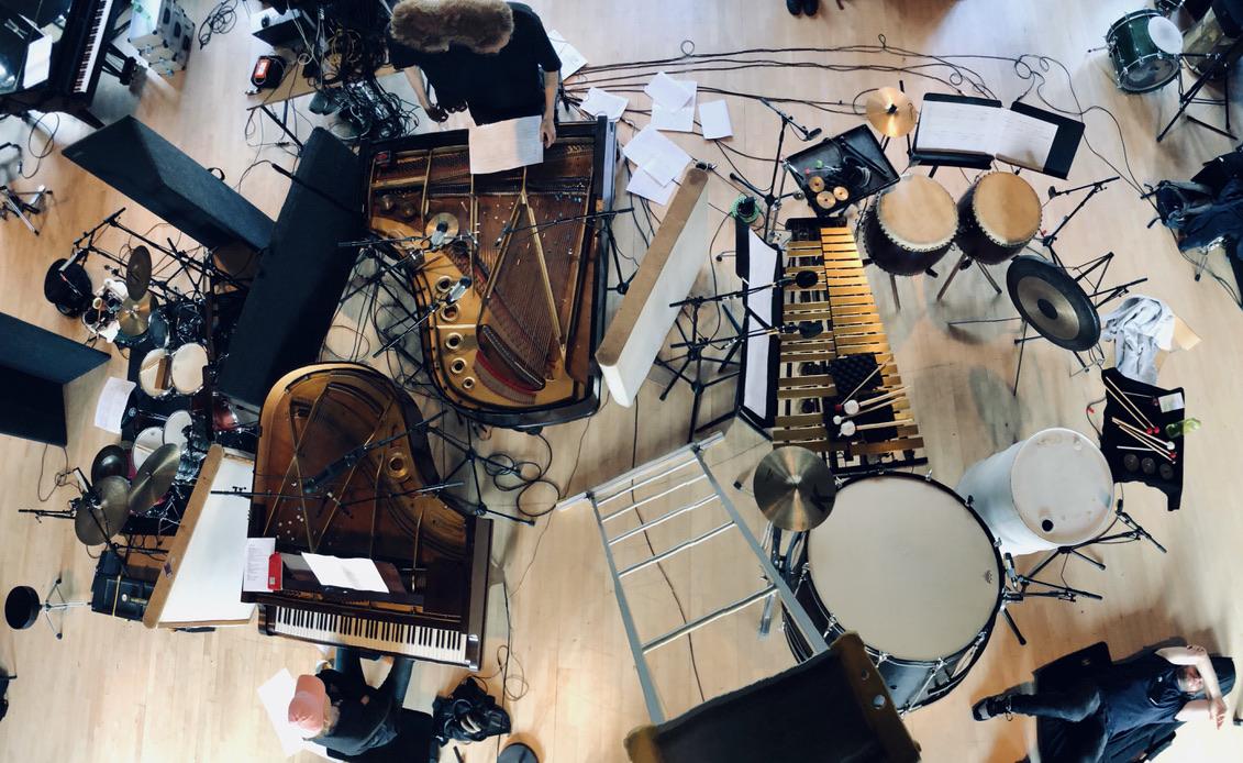 Classical percussion office: microtonal vibraphone, two taiko drums, oil can, orchestral bass drum, cymbals, crotales Extended drum kit: with rodo-toms, smalls gongs, singing bowls.