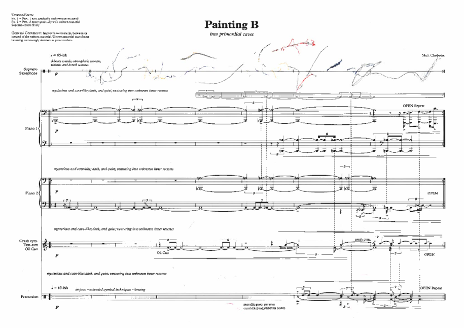Paintings have been used, mainly for my own purposes, to reflect upon macro-form intentions and overall themes. I’ve used paintings by my grandfather, Don Choboter, to abstract upon the theme of palaeolithic cave paintings and how they may relate to liminality from a more objective perspective. Palaeolithic cave art, from say the Dordogne region in Southern France, offers potential insights into the early early “human” psyche and its movement between consciousness and the subconscious. Looking into the future, I expect this project to become increasingly linked to liminal visual communication, whether within the ensemble or from without (the audience perception).