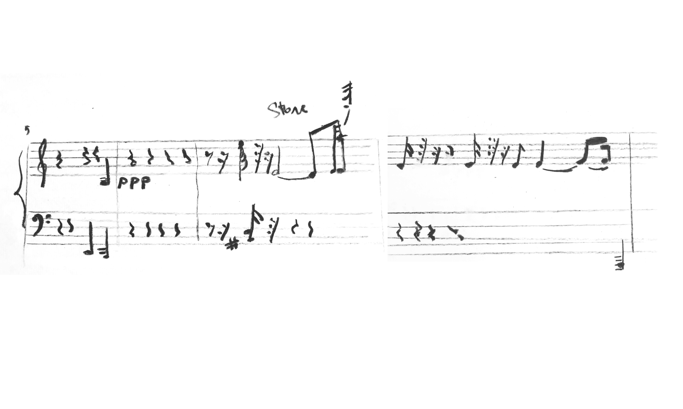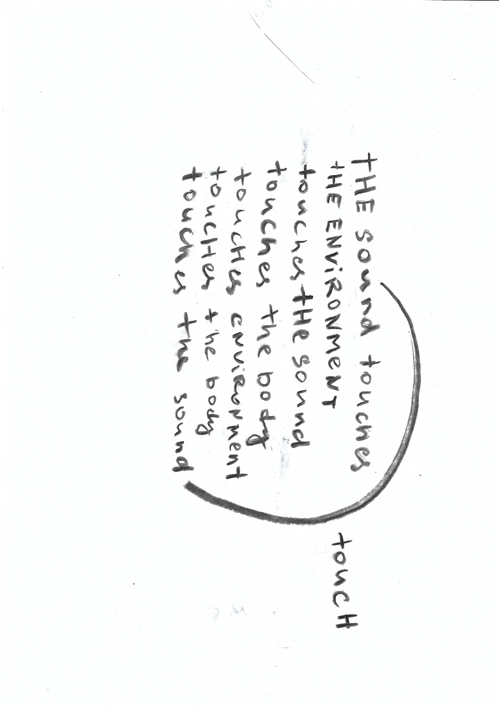 Touching through the darkness with yourself, an inseparable draw arises to return to a place that is tactilely attractive, more reliable, more tolerant. Taking a small stone in my hands and slowly moving away from the familiar touch, a sound was born. The sound made such an enveloping reality there, in that very darkness. I wanted to stay in/with this sound, and at the same time I had a desire to destroy it with something more foreign, something noisy and sharp. Knocking the surface more strongly seemed to intensify the distance from the place. Why did one have to touch and seek coalescence, if the desire was to break it all the time? That coalescence was lost in the depths of these thundering layers of darkness. At a certain point I was losing the borders of my own body in the movement through/inside that darkness. What was inside? Moving further and further away through the consonance of two stones, and the body turns out to be only an intermediary in these relationships. There is a stop inside, and having heard it, the body can sense that there is only one safe scenario: not to leave this state. Leaving this sound through your own darkness, where the position of the body is now without boundaries.
