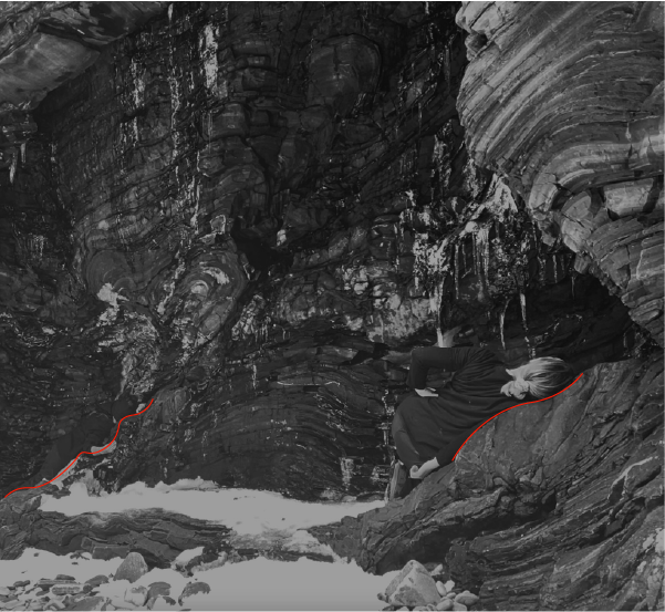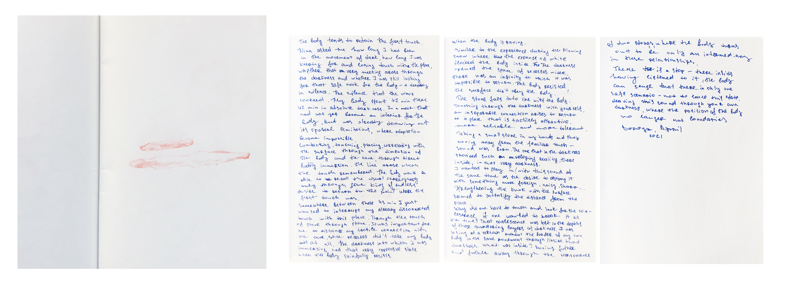 The surface of the soil we touch grows flatter. The correspondence has a soft rhythm, and in our walking the body gradually dissolves. The environment ceases to be occupied, and the space in which we found ourselves opens up; there are several paths that seem to lead to a place with a niche for a long sojourn. A concave space in which the body finds silence and stillness. A nook tucked in the very depths of the corridor of layered stones. Through many levels of these stones, we slowly sink into a place that is so easy to go through. The place is inside the bend of those rhythmic and multi-layered stones. The softness of this place creates a false sense of calmness. It envelops the body, it extends an invitation into itself. Duality arises at the moment of touch when you are inside the cave, it repels; it does not allow you to find a niche for the body, it does not welcome or keep you inside. Openness destroys that sacredness; the body does not find silence within. The softness of this place falsely creates a sense of tranquillity and enswathes the body through rejection.