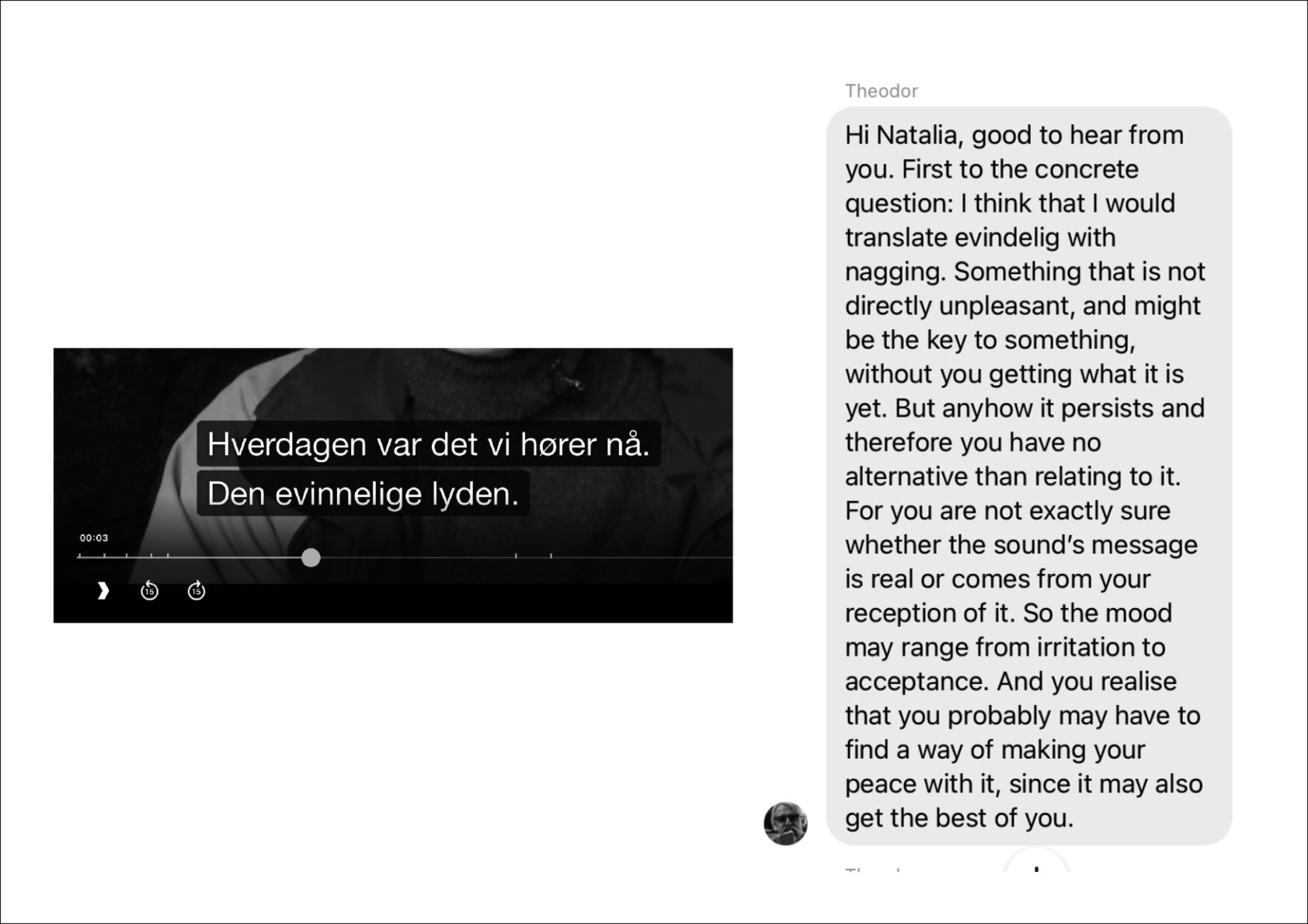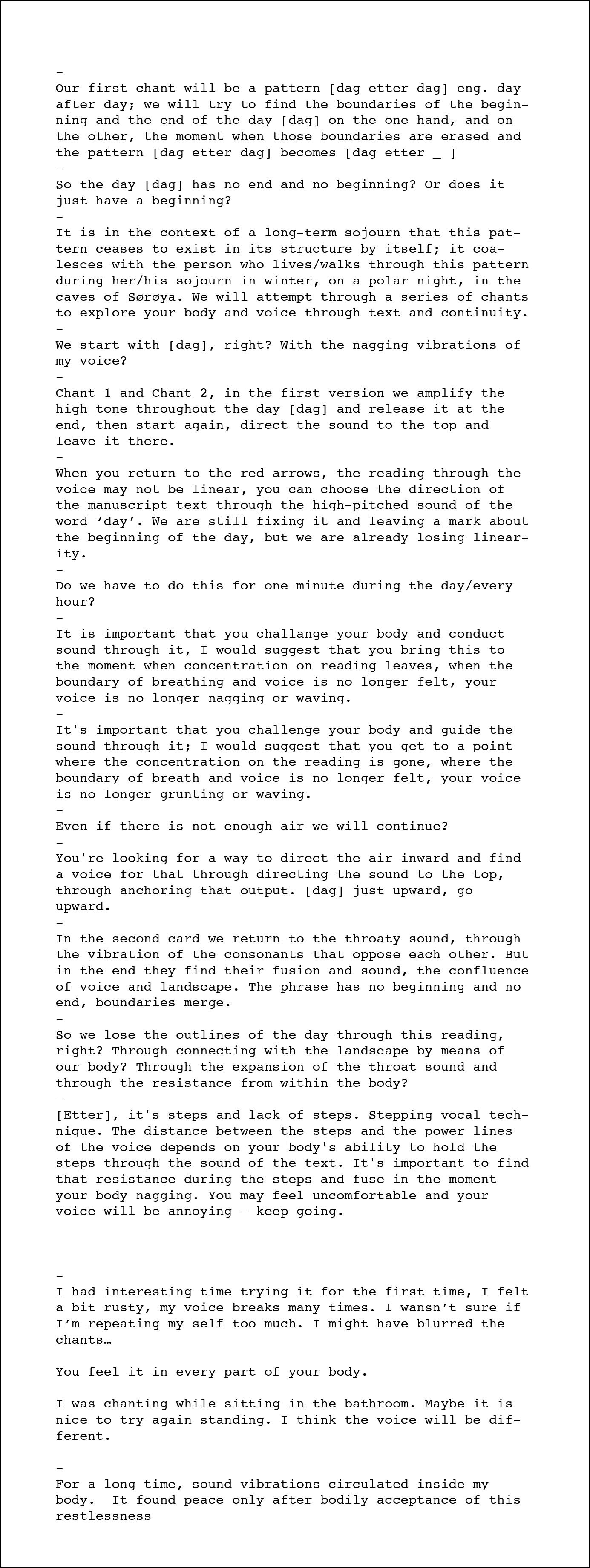 This workshop is about touching memory through the experience of body resistance/conflux-of-voice. In seeking to understand the nature of the sound[ing] described by one of the cave dwellers, Nataliia formulated the question of translating that sound into a vocal and bodily experience as such. Theodor Barth suggested to Nataliia that the word "evinnelige/evindelig" mentioned in the description of the sound could, among other things, be translated as [nagging].