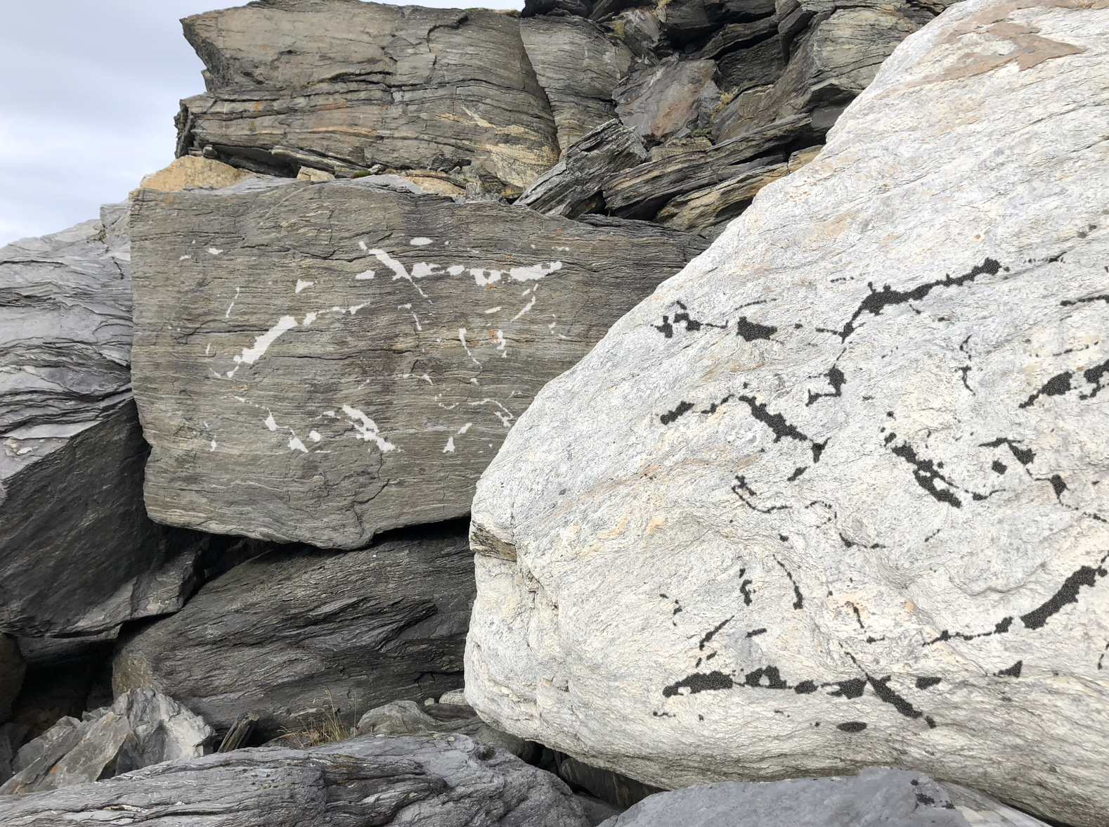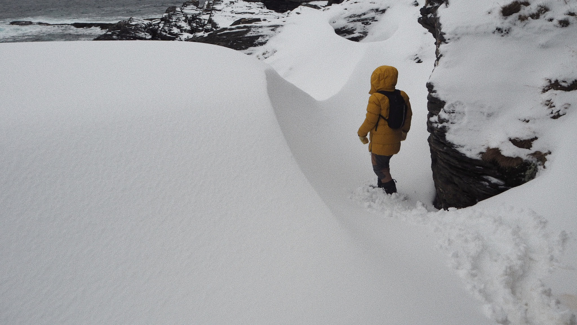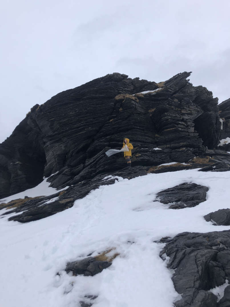 One day, the wind blocked access to Sørøya while our bodies were on the island. We were immobilized, unable to see, unable to move. Sound has become our guide to the very depths of the Sørøya soil. Touch has become our vision, through delicate steps, touching the locality. The gaps between the slate surfaces, the air, and the snow created an audiovisual complexity of the landscape layers. These layers are intertwined through time, history, and locality, and we were in between them.