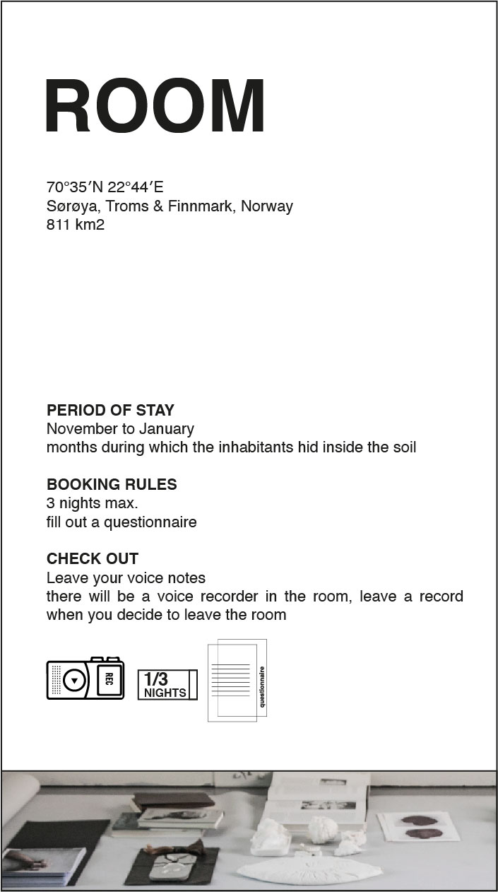 Since Hasvik, like many other areas in northern Norway, was rebuilt after World War II, the landscape retained only the memory of the houses, the knowledge of which went deep into the soil. People continued to live and observe certain social rituals, changing their paradigm of being inside the new interior of the caves. We wondered how this transition from the private space of the home to the public space takes place, how the space of the cave becomes a public space, preserving the very private safe space of the former homes. Can we return to the archive and memory of the public space of the cave by returning to the memory space of the houses? The working title of this public space is The Room, during the 3 months from November to January one of the rooms in the Hasvik house will be reconstructed through acoustic transformation, opening us a place to share information about the public landscape that people once transformed. During these three months, anyone can stay in this Room and spend some time in it with the possibility of its transformation and the possibility of finding a way to adapt to the new sound conditions of the room's everyday space. In addition, the Room suggests finding the boundaries of public and personal memory space through one's own body and trying to separate oneself from places that already have a deep collective memory and body behavior in places such as the voids of Sørøya.