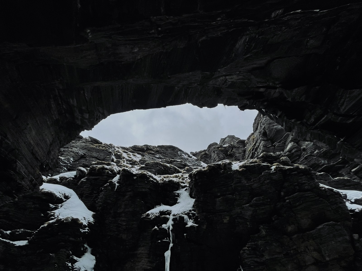 The first touch with the place occurred when we started fieldwork in the winter of 2022. Because of the brutal weather conditions on the island in winter, we decided to start by exploring the two caves that are most accessible in winter: Kvithellhula and Lillemolvika. We went to Sørøya in Hasvik Municipality in January to become immersed in Kvithellhula, where 35 people hid during the winter of 1944/45. The inhabitants of Sørøya left the surface of the earth and descended into its very depths. Among the stones, under metres of snow – their breath touched the rhythms around them.