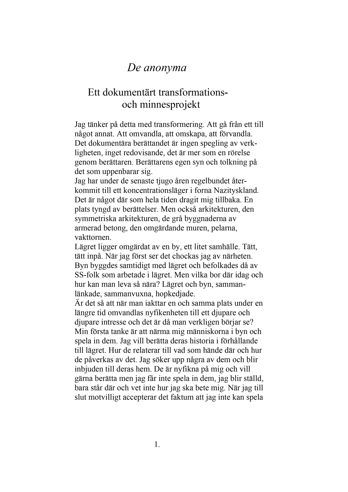 Rapporten för forskningsprojektet De anonyma skrevs efter att verken färdigställts. Den bygger på tankar och reflektioner kring arbetet med verken och utifrån projektets forskningsfrågor: