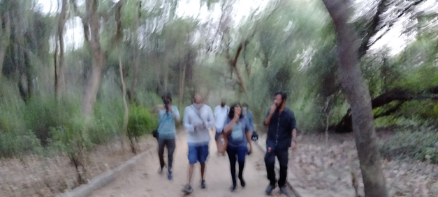 I had been on collective walks earlier but the intent was not to think about walking or actively experience it, it was to serve a purpose-- either towards a destination, to enjoy the journey, religious pilgrimages as a child and a political movement/ march, among others. The conversations and reflections during the recent walk opened up many personal, social and political aspects of the act, our relation to co-walkers, the space and the city’s rhythms at a particular time of the day, gender relations, privilege, class/caste hierarchies, self-care/health and environmental concerns. Since we were walking within a part of a forest open and dedicated for public walks and cycling, the walk was smooth and slow with stops whenever the group wished.