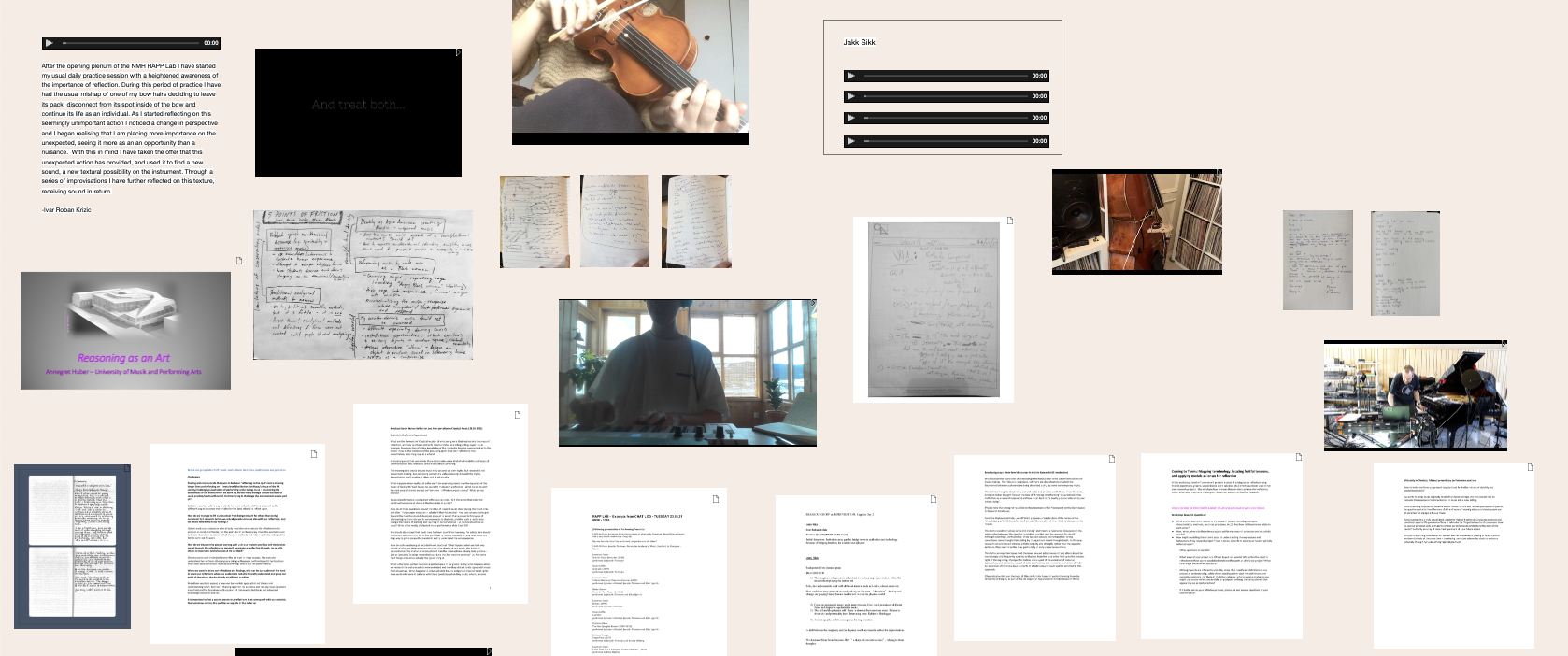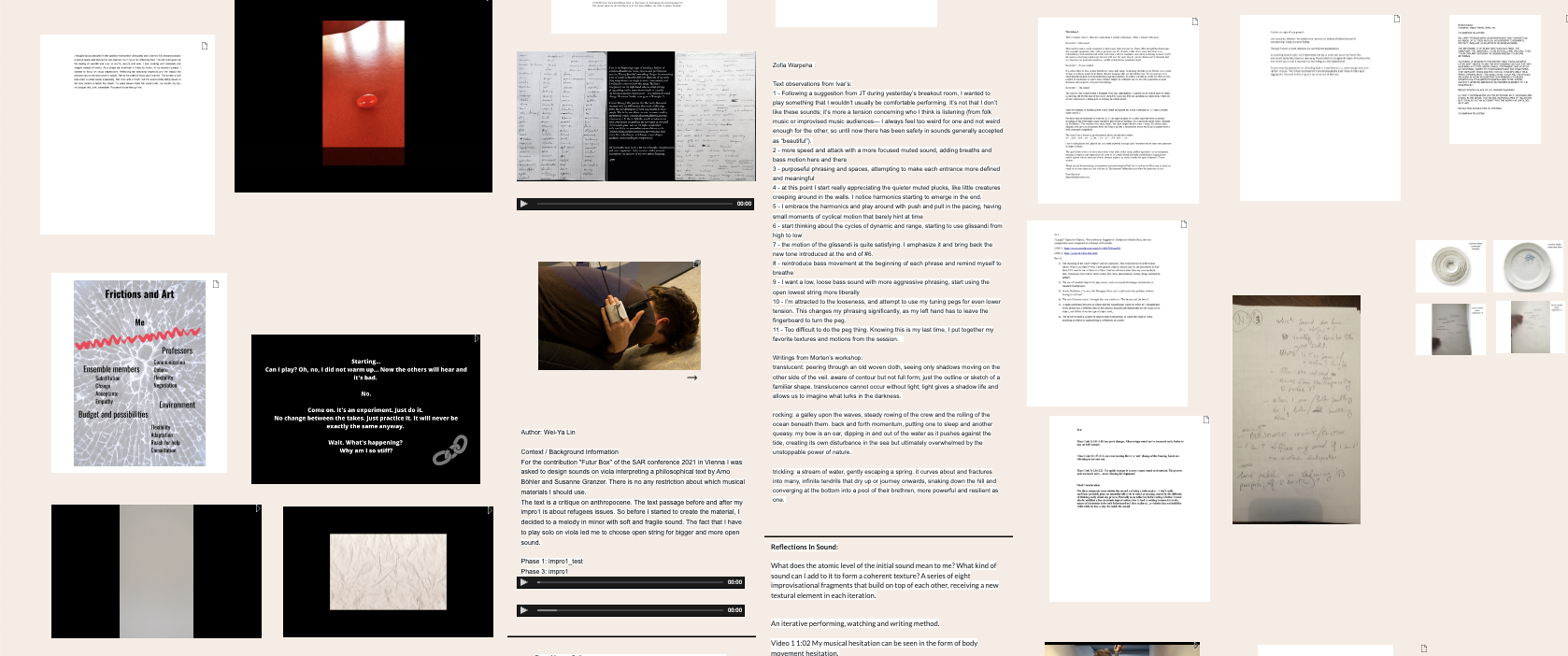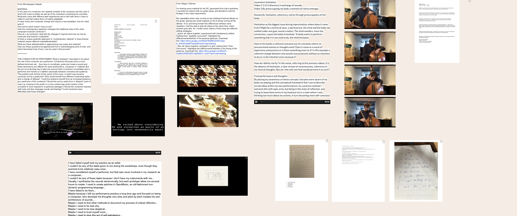 Screenshots from the "process canvas" in Research Catalogue. The canvas includes images, videos, audio files with music, audio files with spoken words and reflections, scribblings, drawings, short notes, more elaborate texts. The canvas was open to all the participants during the week, but not open to public. These screenshots are meant to give you a flavour of how it looked during the Lab week.