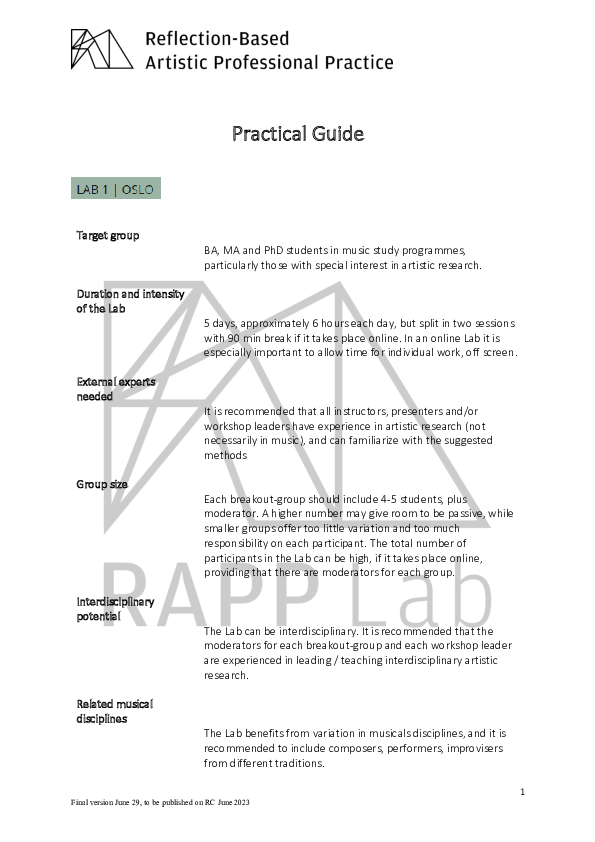 RAPP Lab was a three-year EU-funded research project supported by the ERASMUS+ programme "Strategic Partnerships". RAPP stands for "Reflection based Artistic Professional Practice". The project took forward through a series of multi-national encounters described as Labs. RAPP Lab explored how the reflective methodologies of Artistic Research empower musicians to creatively respond to the economic-cultural environment with which they are confronted. The project brought together the Artistic Research expertise of seven partner institutions in six different European states: Association Européenne des Conservatoires – AEC Bruxelles, Belgium Conservatorio di Musica Santa Cecilia Rome, Italy Eesti Muusika- ja Teatriakadeemia Tallinn, Estonia Hochschule für Musik und Tanz Köln, Cologne, Germany (as Coordinator) mdw – Universität für Musik und darstellende Kunst Wien, Vienna, Austria Norges musikhøgskole, NMH Oslo, Norway Orpheus Instituut Ghent, Belgium