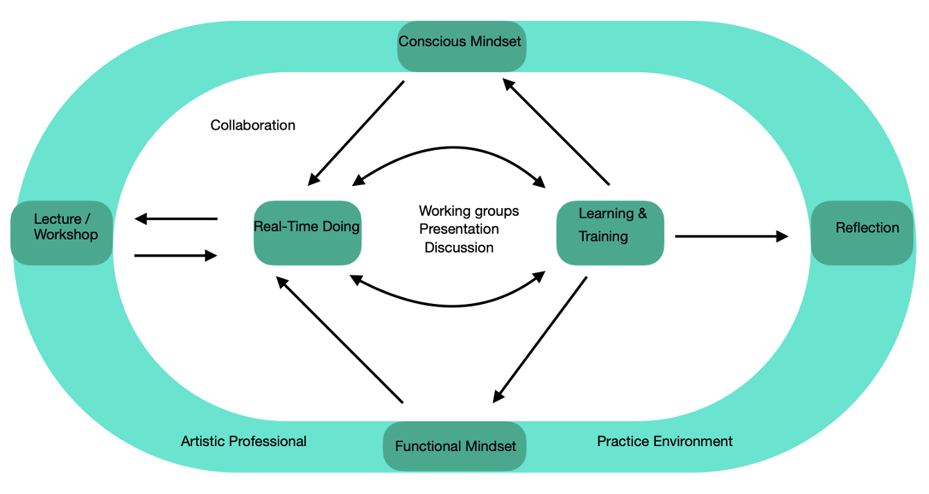 Improvisation as a ‘hybrid toolset’: in an Artistic Professional Practice Environment an experimental approach (concerning participants’ functional mindset) and reflexive approach (concerning participants’ consciousmindset); a hybrid toolset as it demarcates a process (real-time doing), in which improvisation takes place (learning & training) – in a cooperative learning environment (collaboration) which is experienced to produce, not only, immediate results, but which is then used to reflect and bringing specific time-oriented activities to create (reflection).