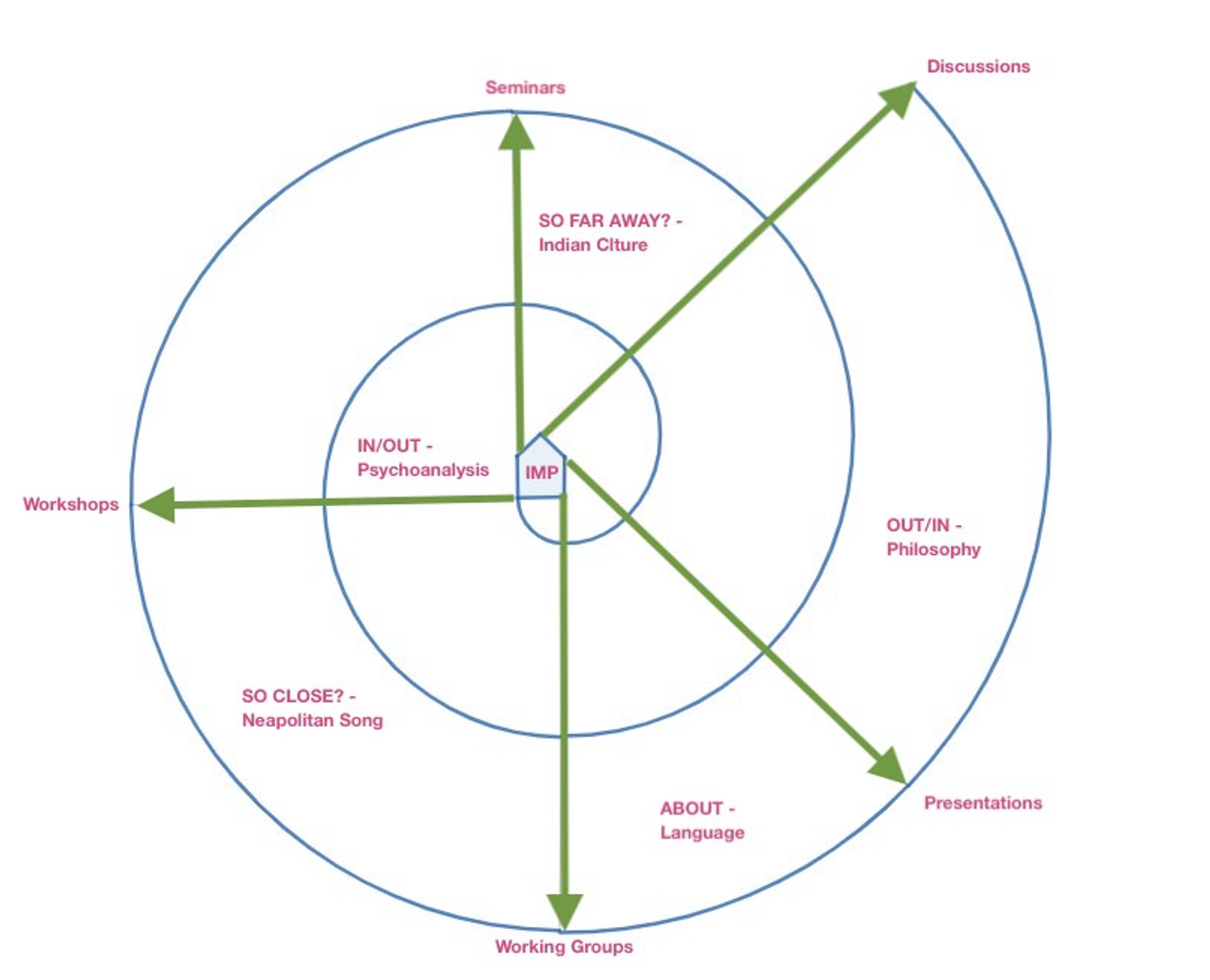 The idea is that of a process that moves along a vertical axis in a spiral way: every time students/researchers face their original path their view will be both lengthened (looking farther) and enlarged (including neighbouring fields or very distant ones). This is because the ‘spiral’ lets them explore a wider field being never in the same point even if their path, their aim remains the same.
