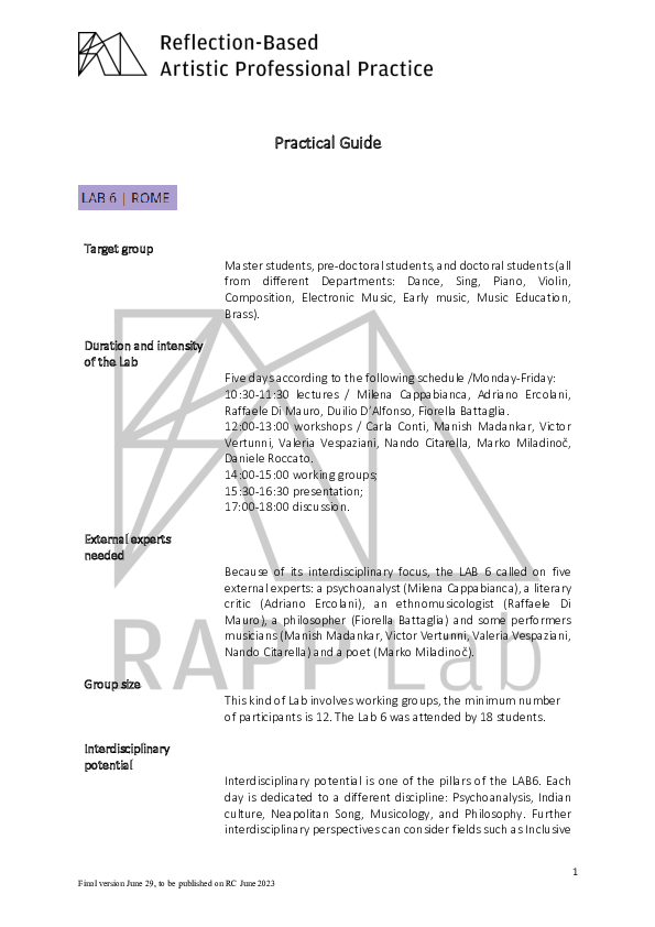 RAPP Lab was a three-year EU-funded research project supported by the ERASMUS+ programme "Strategic Partnerships". RAPP stands for "Reflection based Artistic Professional Practice". The project took forward through a series of multi-national encounters described as Labs. RAPP Lab explored how the reflective methodologies of Artistic Research empower musicians to creatively respond to the economic-cultural environment with which they are confronted. The project brought together the Artistic Research expertise of seven partner institutions in six different European states: Association Européenne des Conservatoires – AEC Bruxelles, Belgium Conservatorio di Musica Santa Cecilia Rome, Italy Eesti Muusika- ja Teatriakadeemia Tallinn, Estonia Hochschule für Musik und Tanz Köln, Cologne, Germany (as Coordinator) mdw – Universität für Musik und darstellende Kunst Wien, Vienna, Austria Norges musikhøgskole, NMH Oslo, Norway Orpheus Instituut Ghent, Belgium