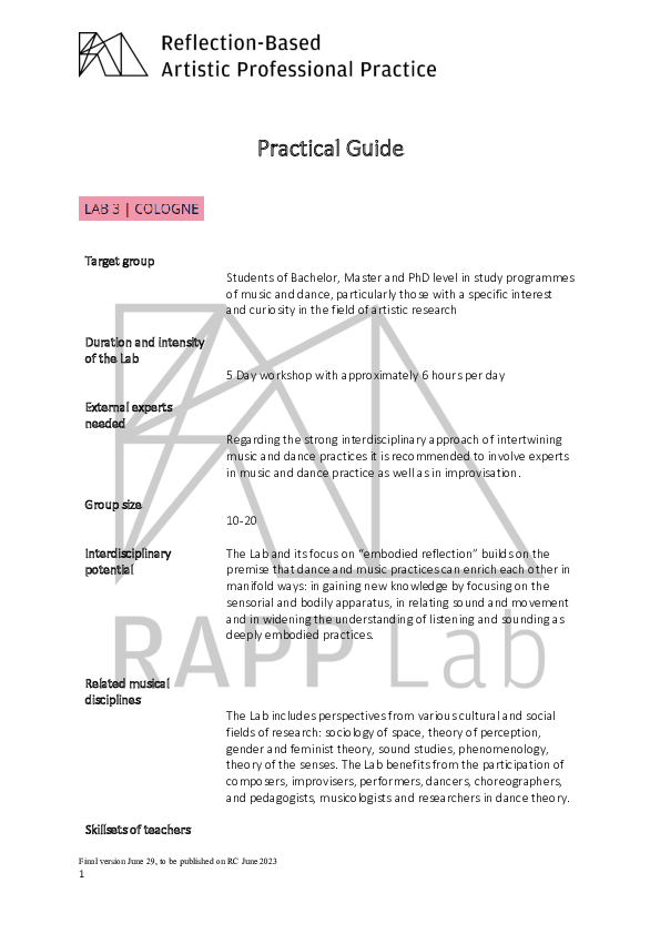 RAPP Lab was a three-year EU-funded research project supported by the ERASMUS+ programme "Strategic Partnerships". RAPP stands for "Reflection based Artistic Professional Practice". The project took forward through a series of multi-national encounters described as Labs. RAPP Lab explored how the reflective methodologies of Artistic Research empower musicians to creatively respond to the economic-cultural environment with which they are confronted. The project brought together the Artistic Research expertise of seven partner institutions in six different European states: Association Européenne des Conservatoires – AEC Bruxelles, Belgium Conservatorio di Musica Santa Cecilia Rome, Italy Eesti Muusika- ja Teatriakadeemia Tallinn, Estonia Hochschule für Musik und Tanz Köln, Cologne, Germany (as Coordinator) mdw – Universität für Musik und darstellende Kunst Wien, Vienna, Austria Norges musikhøgskole, NMH Oslo, Norway Orpheus Instituut Ghent, Belgium