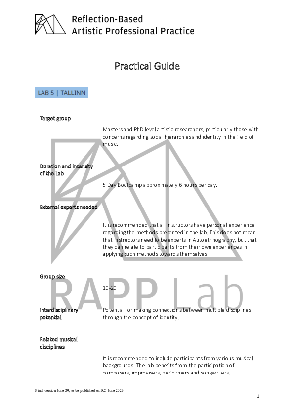 RAPP Lab was a three-year EU-funded research project supported by the ERASMUS+ programme "Strategic Partnerships". RAPP stands for "Reflection based Artistic Professional Practice". The project took forward through a series of multi-national encounters described as Labs. RAPP Lab explored how the reflective methodologies of Artistic Research empower musicians to creatively respond to the economic-cultural environment with which they are confronted. The project brought together the Artistic Research expertise of seven partner institutions in six different European states: Association Européenne des Conservatoires – AEC Bruxelles, Belgium Conservatorio di Musica Santa Cecilia Rome, Italy Eesti Muusika- ja Teatriakadeemia Tallinn, Estonia Hochschule für Musik und Tanz Köln, Cologne, Germany (as Coordinator) mdw – Universität für Musik und darstellende Kunst Wien, Vienna, Austria Norges musikhøgskole, NMH Oslo, Norway Orpheus Instituut Ghent, Belgium