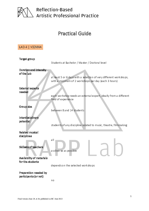 RAPP Lab was a three-year EU-funded research project supported by the ERASMUS+ programme "Strategic Partnerships". RAPP stands for "Reflection based Artistic Professional Practice". The project took forward through a series of multi-national encounters described as Labs. RAPP Lab explored how the reflective methodologies of Artistic Research empower musicians to creatively respond to the economic-cultural environment with which they are confronted. The project brought together the Artistic Research expertise of seven partner institutions in six different European states: Association Européenne des Conservatoires – AEC Bruxelles, Belgium Conservatorio di Musica Santa Cecilia Rome, Italy Eesti Muusika- ja Teatriakadeemia Tallinn, Estonia Hochschule für Musik und Tanz Köln, Cologne, Germany (as Coordinator) mdw – Universität für Musik und darstellende Kunst Wien, Vienna, Austria Norges musikhøgskole, NMH Oslo, Norway Orpheus Instituut Ghent, Belgium
