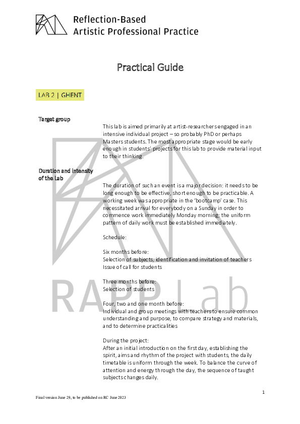 RAPP Lab was a three-year EU-funded research project supported by the ERASMUS+ programme "Strategic Partnerships". RAPP stands for "Reflection based Artistic Professional Practice". The project took forward through a series of multi-national encounters described as Labs. RAPP Lab explored how the reflective methodologies of Artistic Research empower musicians to creatively respond to the economic-cultural environment with which they are confronted. The project brought together the Artistic Research expertise of seven partner institutions in six different European states: Association Européenne des Conservatoires – AEC Bruxelles, Belgium Conservatorio di Musica Santa Cecilia Rome, Italy Eesti Muusika- ja Teatriakadeemia Tallinn, Estonia Hochschule für Musik und Tanz Köln, Cologne, Germany (as Coordinator) mdw – Universität für Musik und darstellende Kunst Wien, Vienna, Austria Norges musikhøgskole, NMH Oslo, Norway Orpheus Instituut Ghent, Belgium