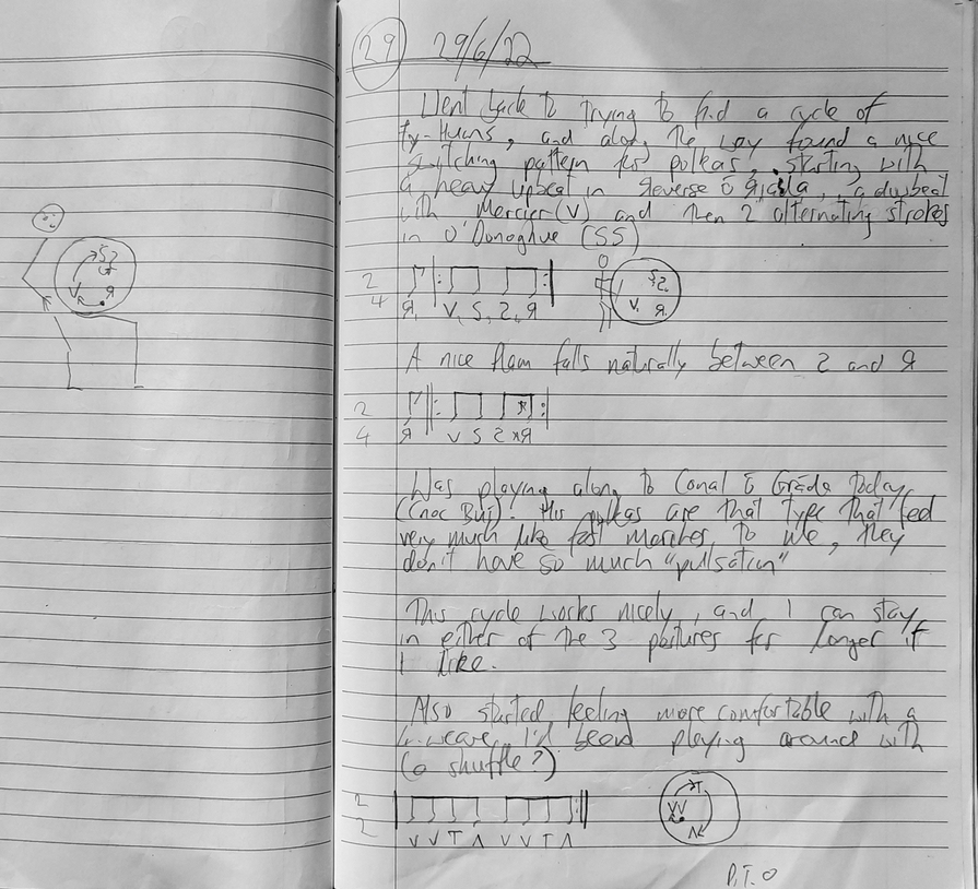 A total of forty sessions of approximately two hours duration each were carried out over the period from 19th May 2022 to 22nd July. These sessions focused on developing a facility with switching between some of those grip postures identified in the Bodhrán Literature and Practice Review section. To this end, I would play to a wide variety of recorded musical sources largely drawn from the Irish tradition of dance music, but from time to time including sources as diverse as Jazz, Scottish traditional music, African music, rock and Hip-hop. I also often played unaccompanied, focusing more directly on the movements in my playing rather than rhythm, in a creative process I term ‘rhyming’.