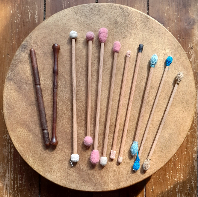 Beginning this project I realised that it might be useful to try using lighter sticks. When getting lessons from Tommy Hayes in early 2021, I had learned that he favoured much lighter sticks than I would normally use, so I figured it might be something worth experimenting with. Not having a lathe to turn sticks from scratch, I decided to use ready-made wooden dowel, and find other materials with which to make the tips. I experimented with weaving different types of twine (as is done for timpani mallets), needle-felting, and also just attaching things like bandages, insulation tape and bottle corks. My current favourite stick uses fluted beech dowel with cotton balls from the art supplies shop as tips.
