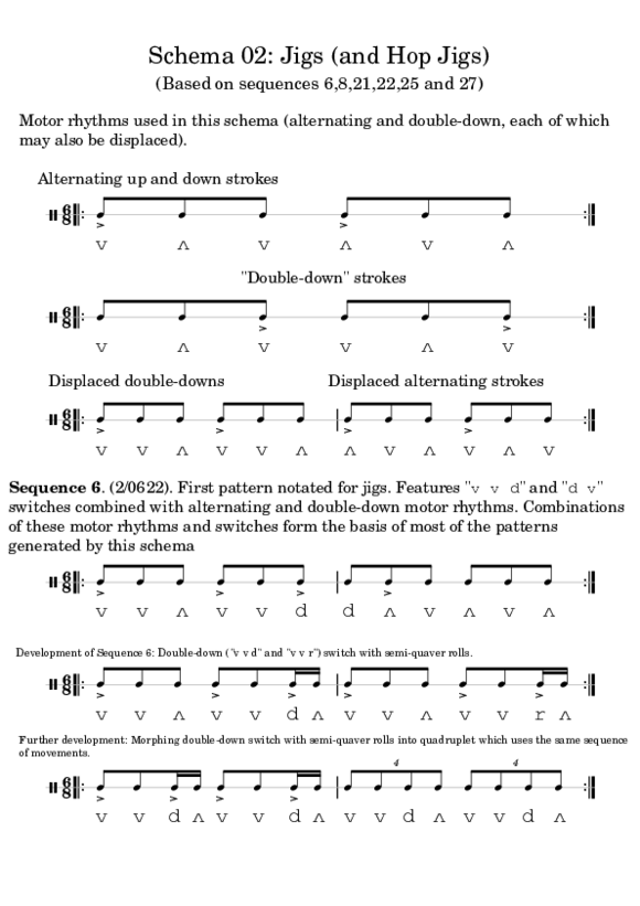 Rather than notating these performances in their entirety, I refer the reader to the linked pdf "schemata" to the right of the videos. These attempt to notationally represent modular rhythmic concepts, a selection of which I embody and combine in these videos. The notation system was developed over the course of this research.