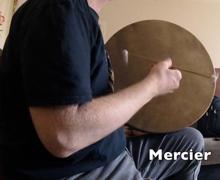 I was introduced to Colm Murphy’s bodhrán tablature when studying with him at the music department in University College Cork (UCC). As well as being a highly-regarded professional bodhrán player, Murphy has decades of experience as a teacher of the instrument in his position as bodhrán tutor at UCC. Seen here on the right, Murphy’s system uses arrowheads to indicate up- and down-strokes, as well as horizontal arrows to indicate lateral movement across the bodhrán head. The symbols representing up and down-strokes can be interpreted as crotchets or quavers depending on the context; a standalone symbol (usually a down-stroke) is a crotchet, whereas two tightly written symbols are quavers. A familiarity with the tune structure and rhythmic swing of Irish traditional music is assumed, as with Ó Súilleabháin’s system.