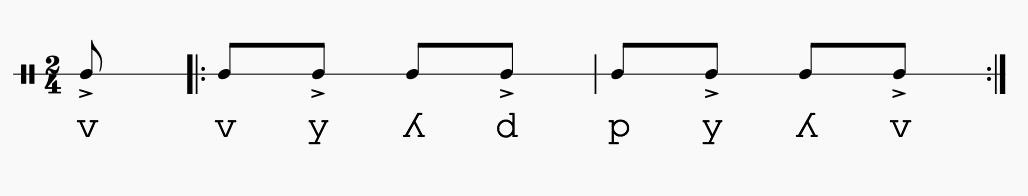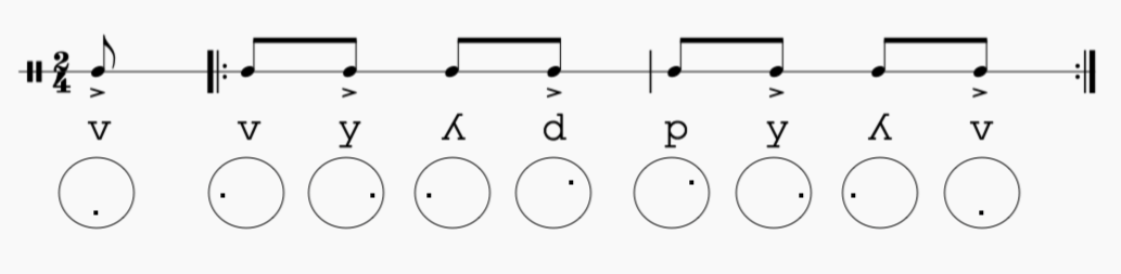 These letter codes are then used to annotate standard, single-line staff systems which outline basic rhythmic structure. In the manner of Ó Súilleabháin and Murphy’s systems, it is assumed that the reader will use their knowledge of the swing and tune structure of Irish traditional music to interpret the notation appropriately. As with Murphy, I use the notation to represent only small rhythmic units (up to two bars in length). Rather than attempting to transcribe entire performances, the notation is used as a mnemonic aid to represent short rhythmic sequences as schemata that can be combined to embody and extemporise larger rhythmic structures. PDF documents containing such schemata can be found in the Grip Switching section. An example of a two-bar polka sequence that switches between the Mercier, Reverse Ó Riada, and O’Donoghue grip postures is given here: