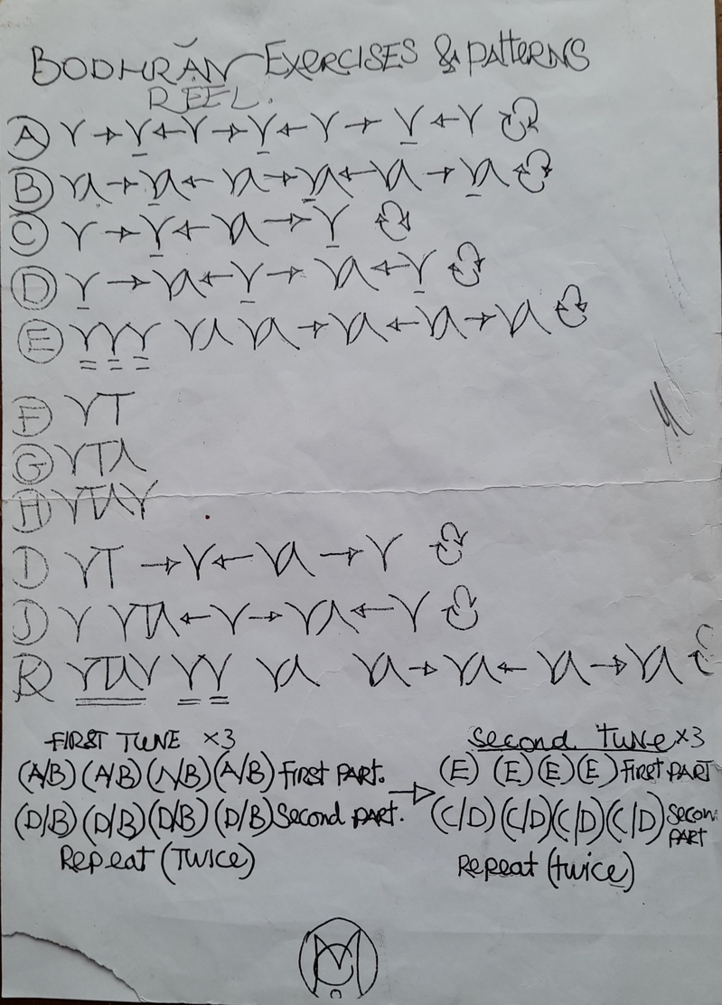Over the course of this research project, and as evidenced in my daily journaling (Sheehan, 2022a), I developed a system of bodhrán notation to enable me to record and reason about aspects of the creative process of grip switching that was at the centre of this research.