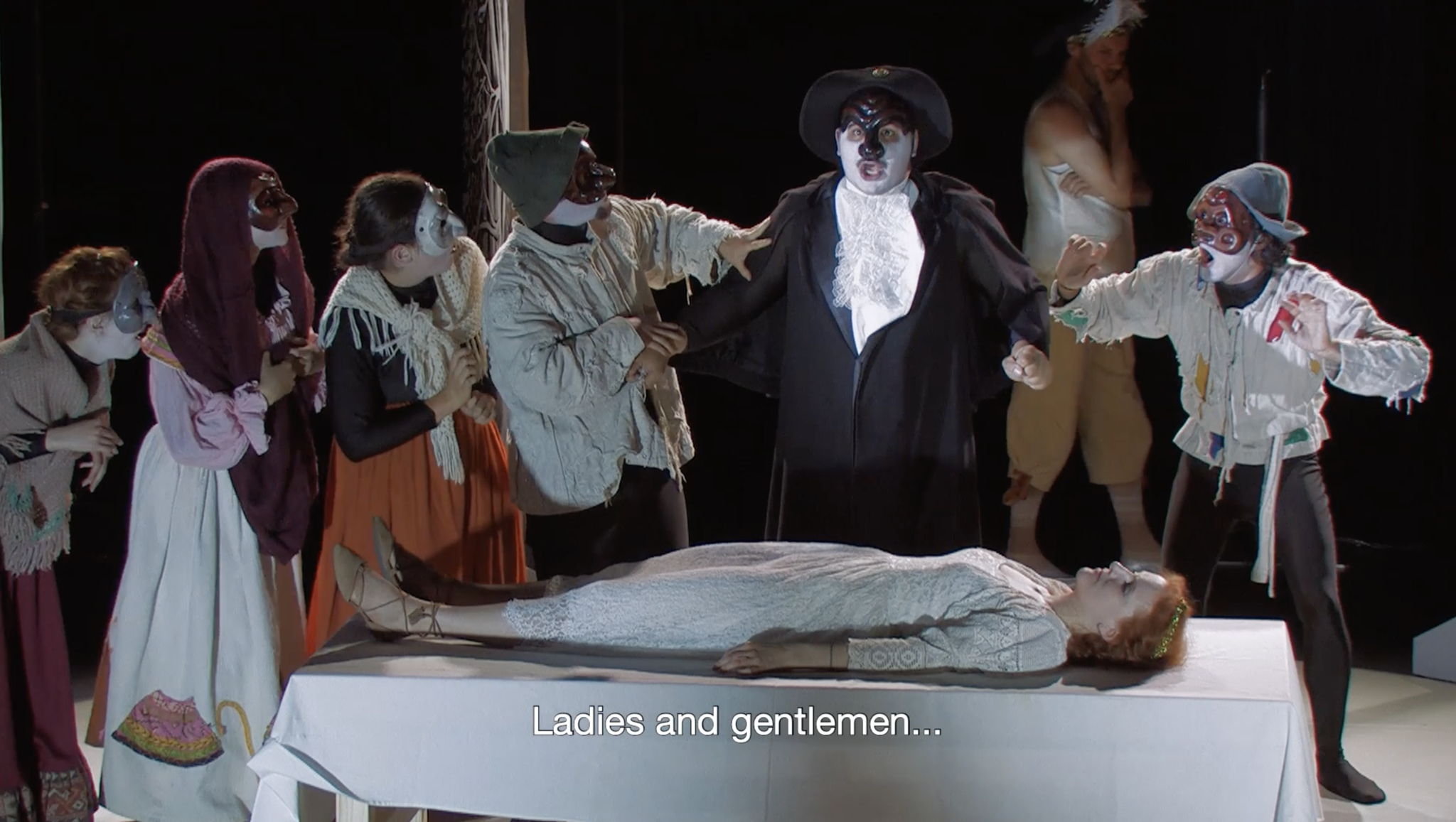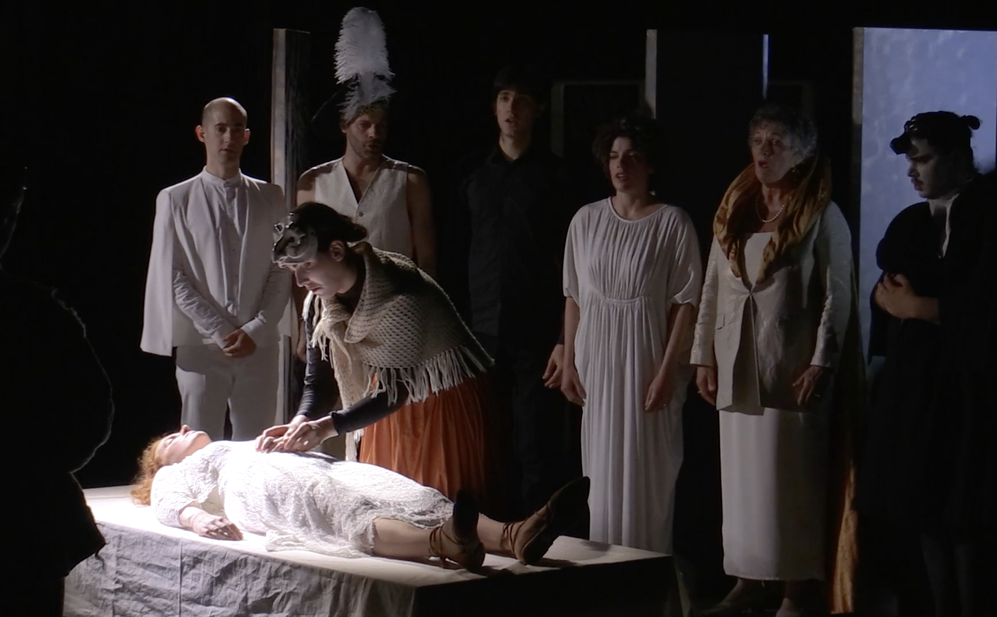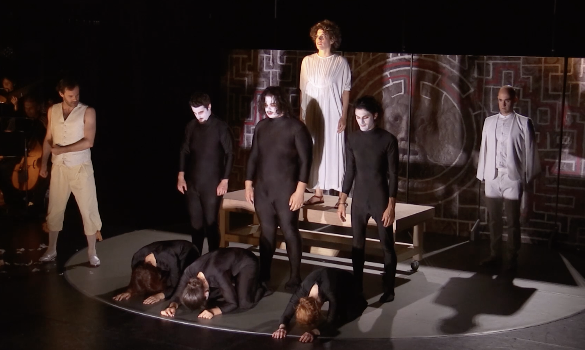 When Orpheus is deported, all the Allegories convene in a ritual circle around Monteverdi and Truth. In the end, having found truth, the composer surrenders by laying his head in her womb.