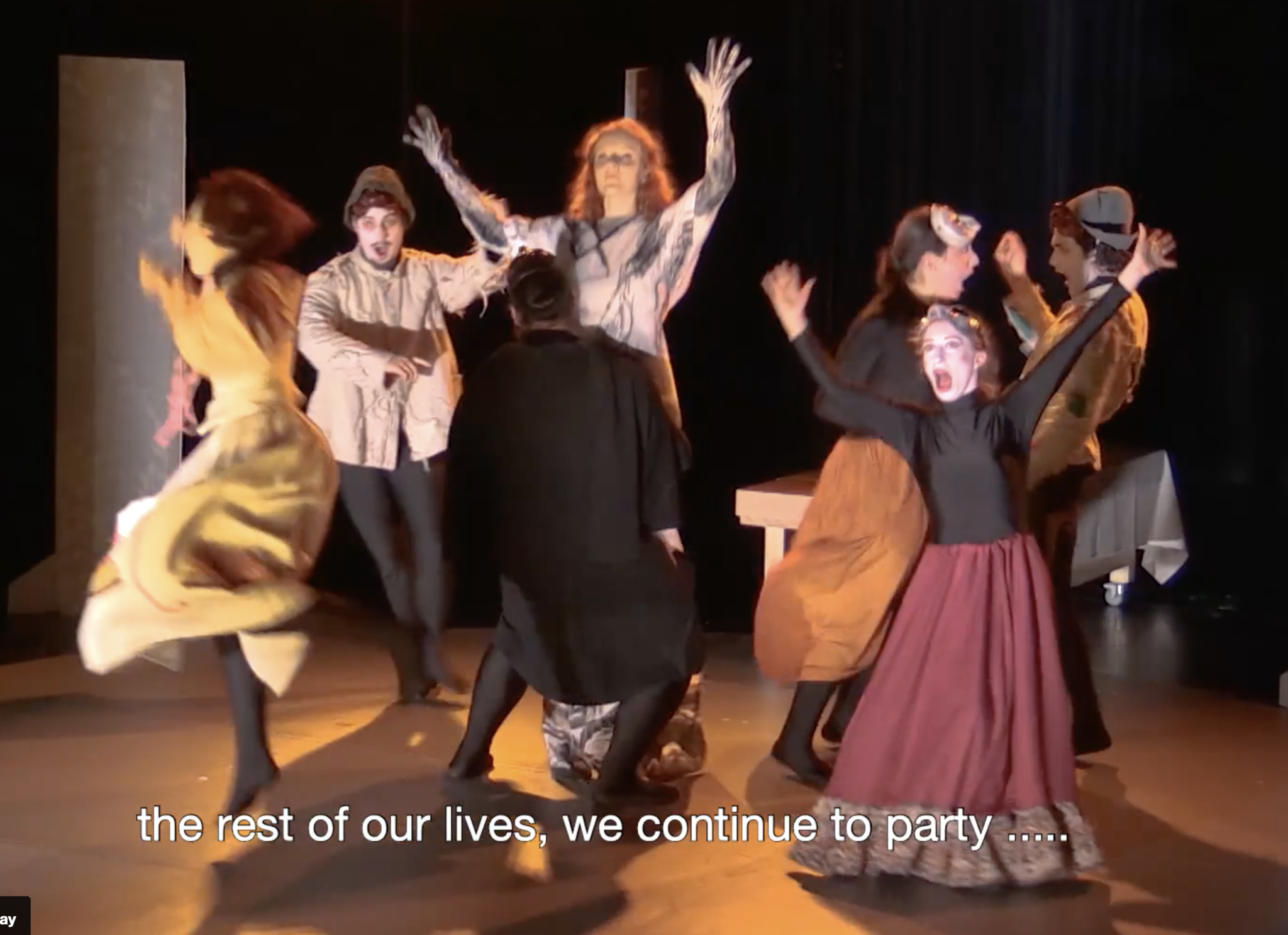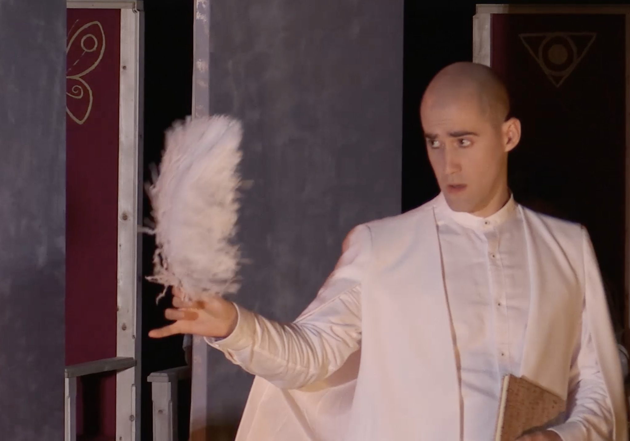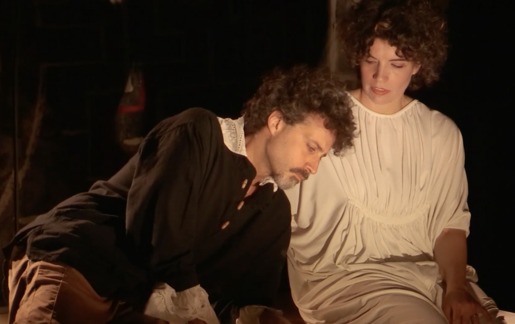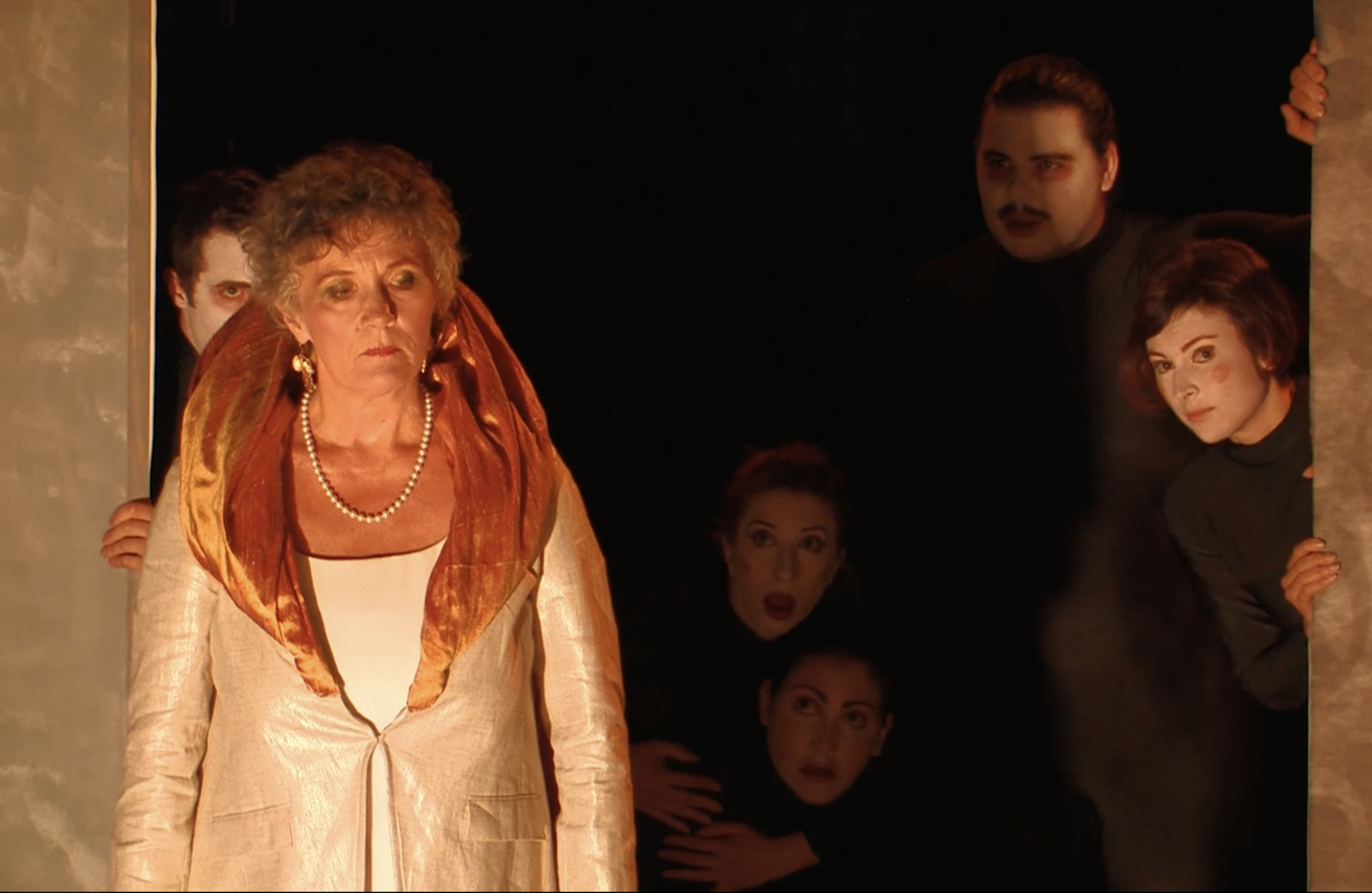 When Orpheus is deported, all the Allegories convene in a ritual circle around Monteverdi and Truth. In the end, having found truth, the composer surrenders by laying his head in her womb.