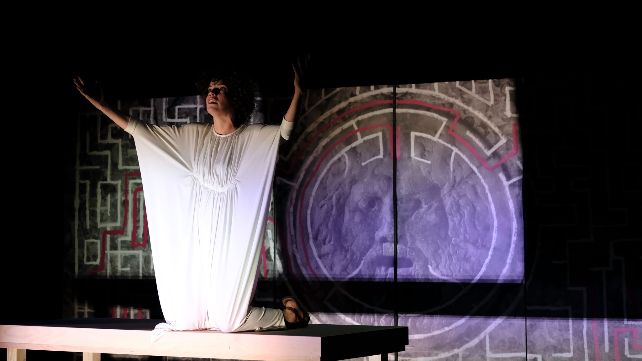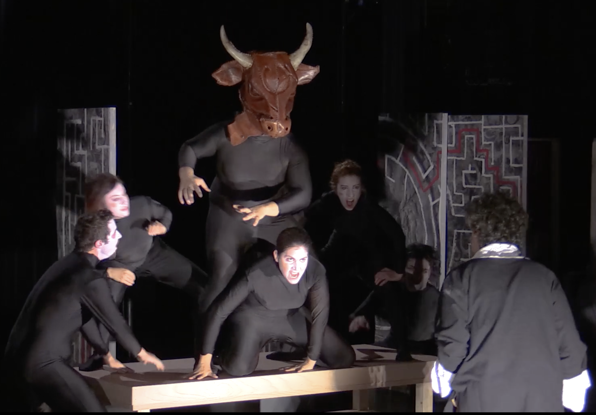 Monteverdi hears a noise that is approaching from the dark labyrinth until he suddenly stands in front of the Minotaur. The raw manifestation of instinct paralyses him.