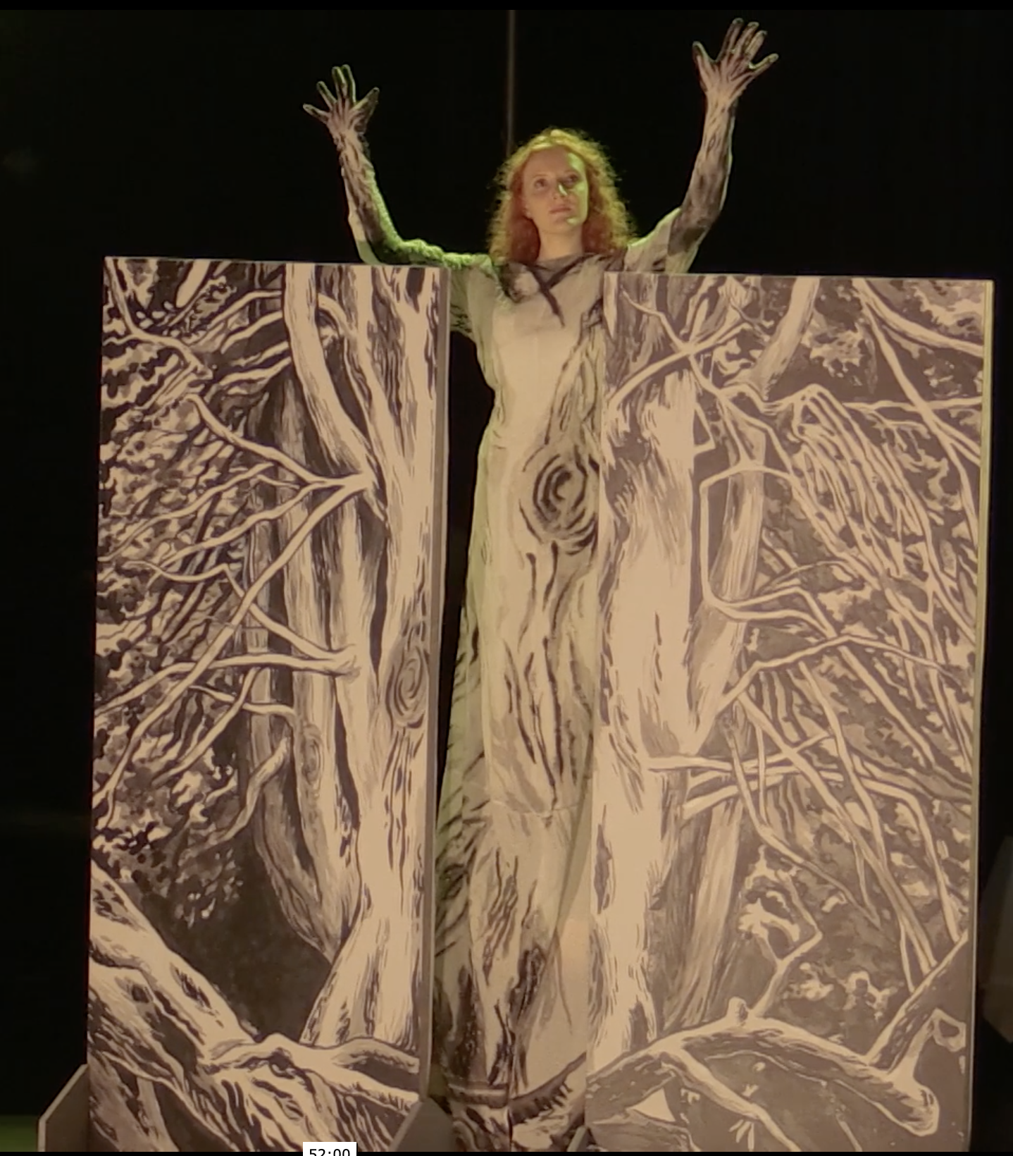The figure Amor is being introduced and will be played splendidly by Caterina Martinelli. Later, she is chased by Apollo as Dafne and appears on stage with her arms turned into branches of a laurel tree. Apollo deplores the metamorphose in a touching aria, which the singer performs with great self-indulgence.