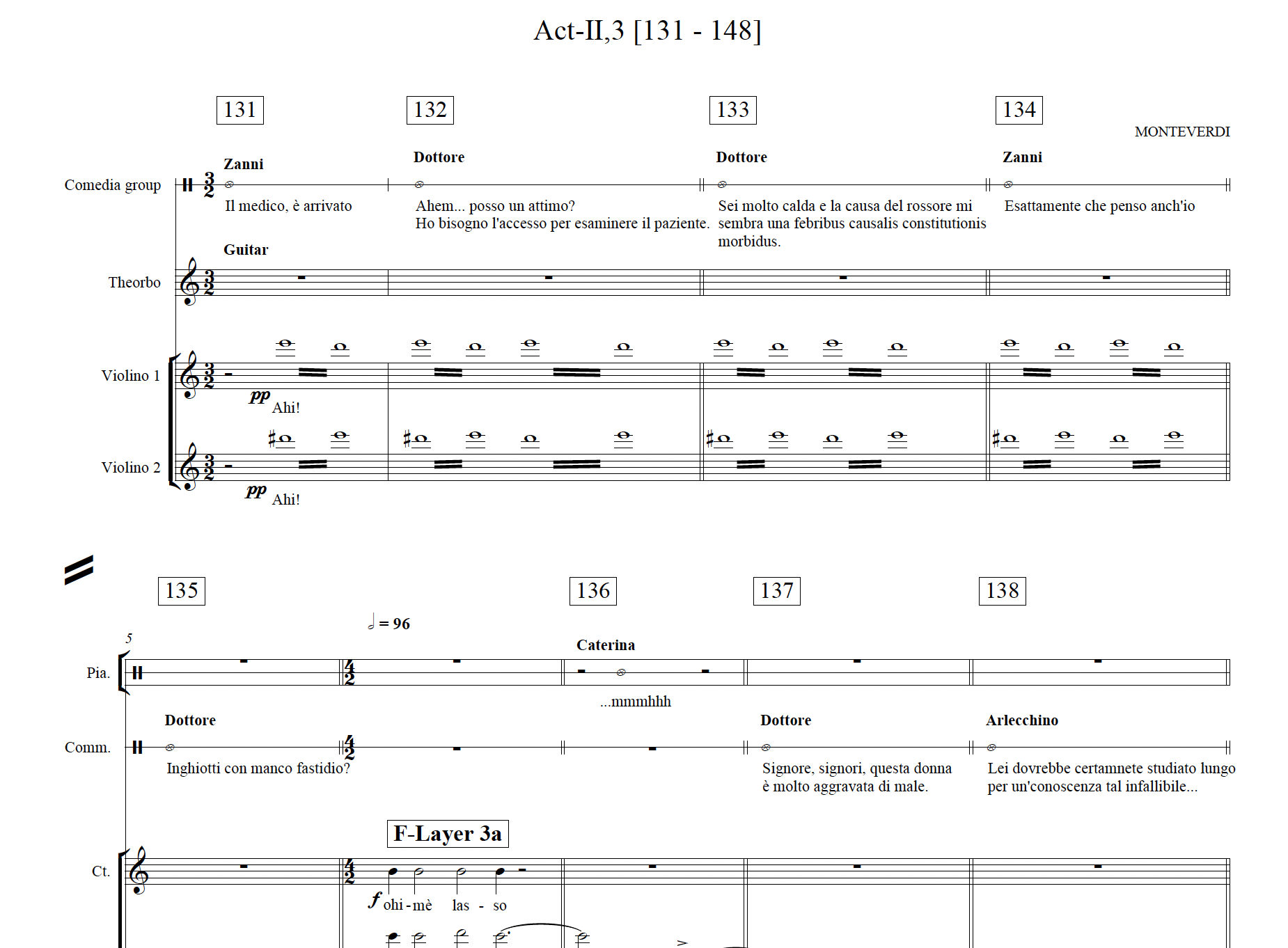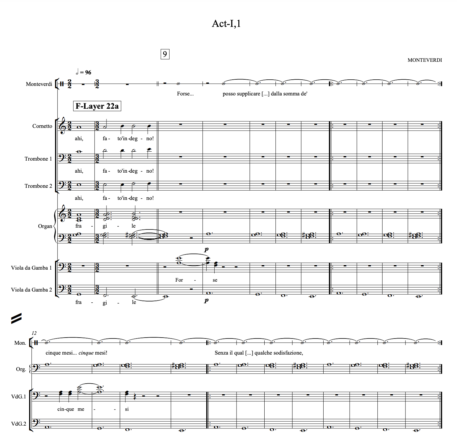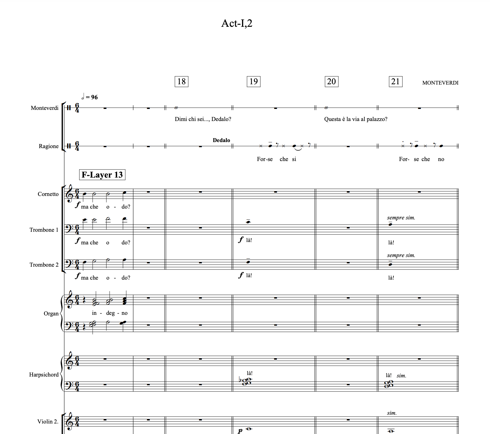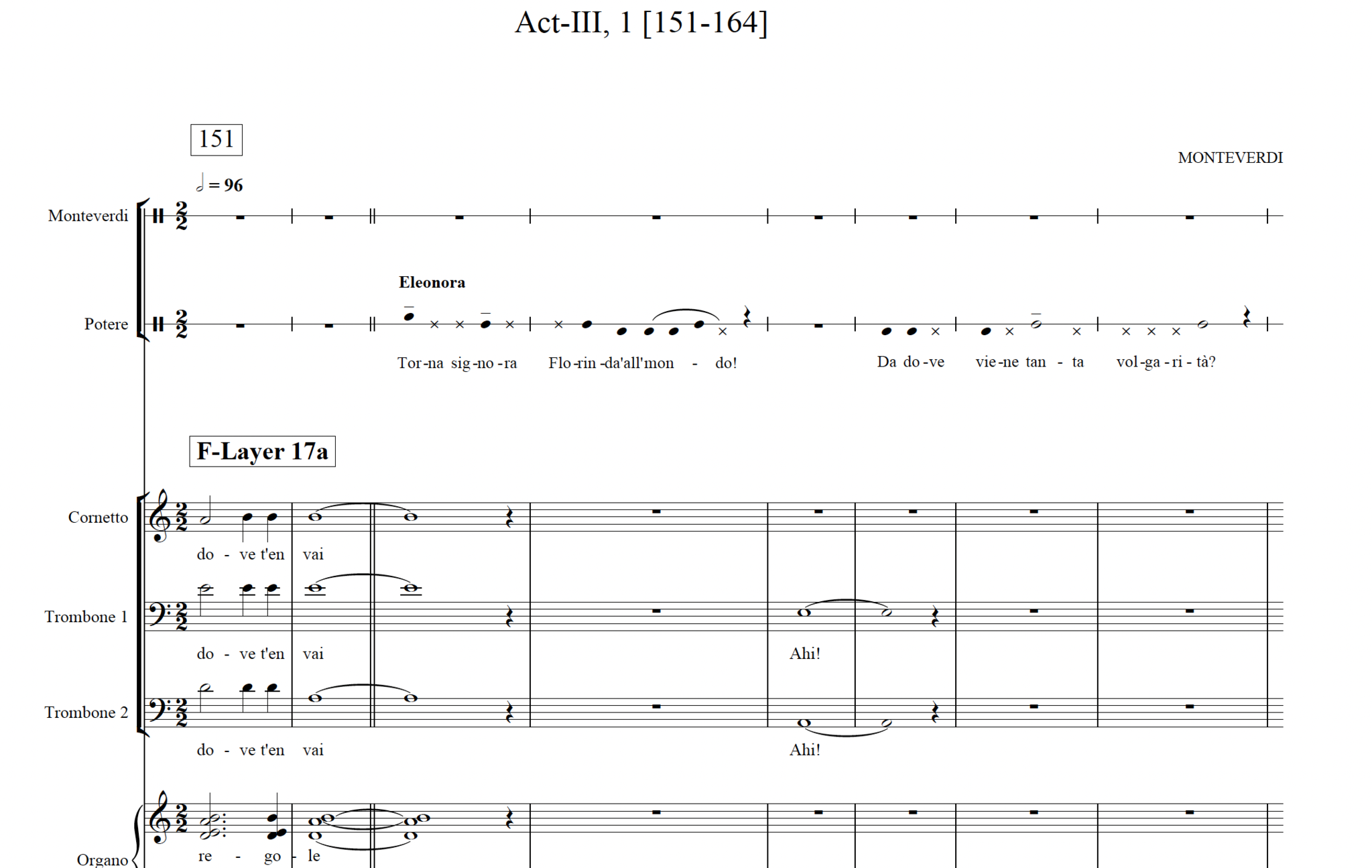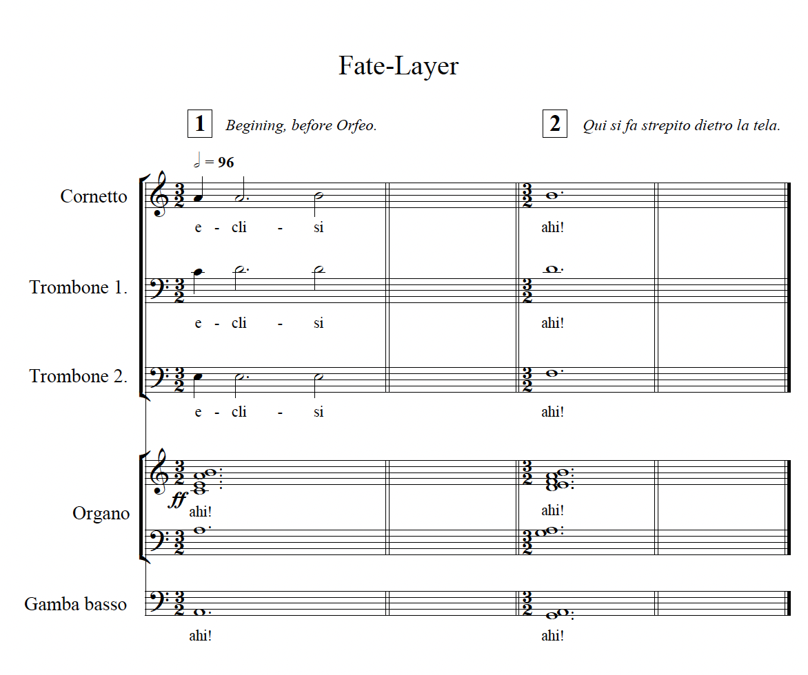 · In the new music: music for the texts, which follows the drama directly; and two ‘Cantus Firmus’ layers: the Monteverdi Layer and the Fate [or Clock] Layer.