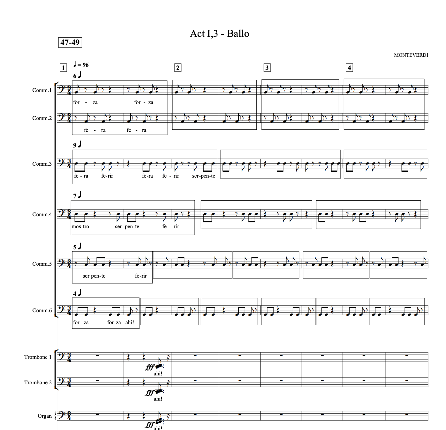 Bar-lines work only as visual adds, delimitating shorter divisions of the music. Accentuations follow the Italian language. Double bar-lines shows the changes between standard notation and the one developed for this Opera. For vertical coordination, check the following topics.